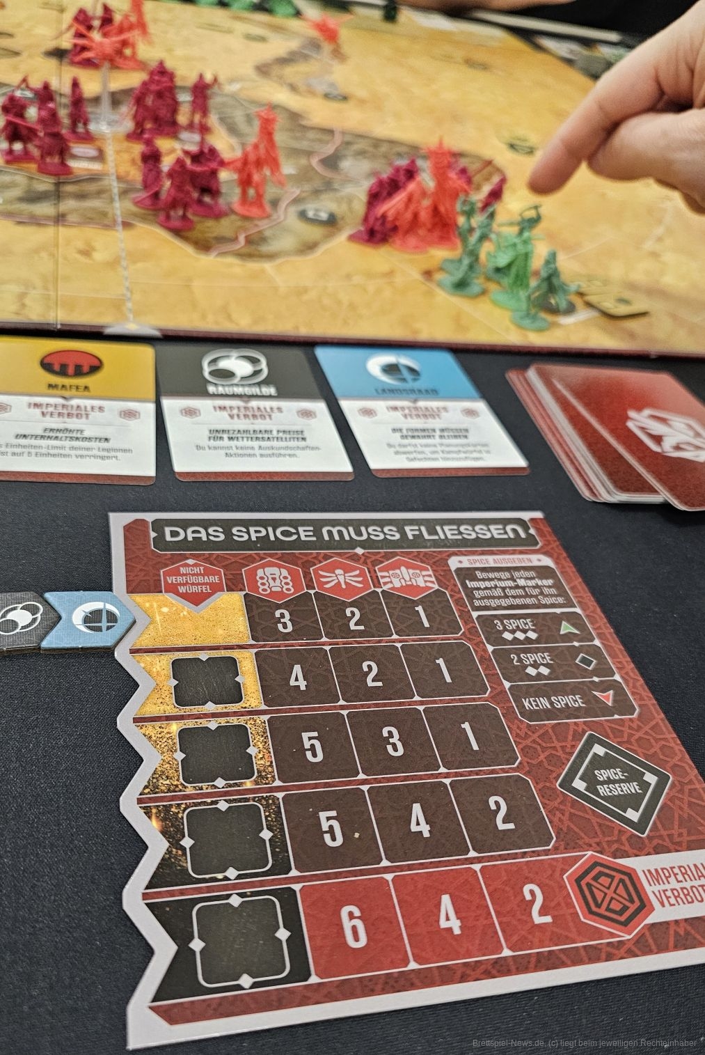 Gespielt wird über mehrere Runden, die in verschiedene Phasen unterteilt sind. Zunächst bringen die Harkonnen ihre Fahrzeuge auf das Spielfeld. Dann werden die Würfel geworfen, untereinander verteilt und eingesetzt. Danach führen beide Parteien abwechseln ihre Spielzüge durch, indem sie mit den Würfeln Aktionen ausführen oder Aktionskarten spielen. Dies ist der Kern im Krieg um Arrakis und bietet eine Fülle an Optionen. Die Karte ist riesig und erlaubt unzählige Taktiken und Strategien.