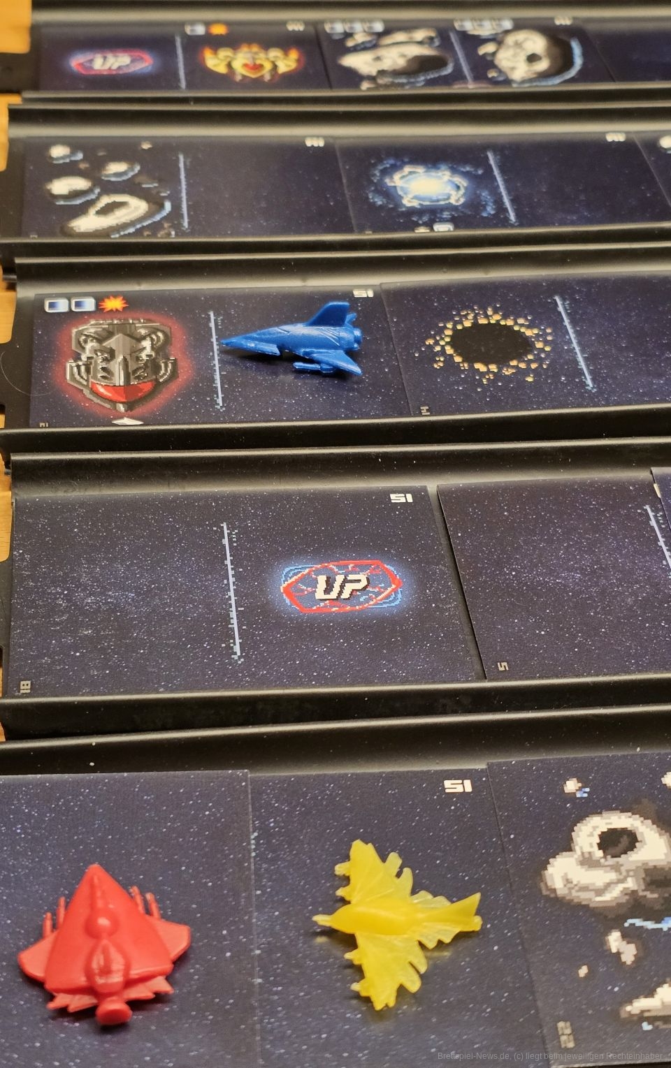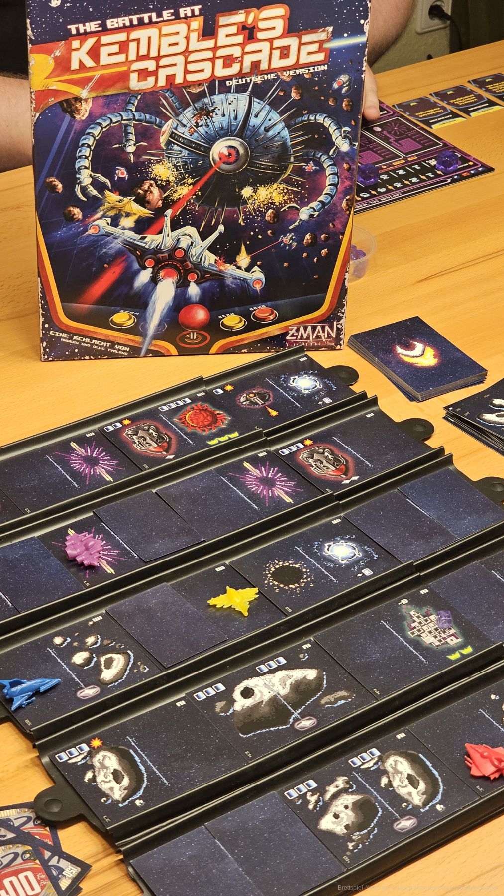 Während des Spiels kamen einige Regelfragen auf. Einiges hätte deutlicher geschrieben sein können. Dadurch streckte sich die Spielzeit mit 5 Personen auf 30 Minuten pro Person in der Erstpartie. Spaß hat "The Battle at Kemble's Cascade" aber gemacht. Sich durch den Weltraum zu ballern, sein Schiff aufzurüsten und dem riesigen Endgegner zu begegnen, gepaart mit der Grafik und dem Bewegungssystem hat seinen Reiz. Das Spiel ist allerdings sehr kompetitiv. Ständig versperren sich die Pilotinnen und Piloten gegenseitig den Weg und schießen sich die Ziele weg. Mit etwas Pech kann man da schon schnell ins Hintertreffen geraten. So ist es auch mir passiert. Bei der Länge des Spiels kann das schon etwas frustig sein, denn einen Aufholmechanismus gibt es nicht. Vielleicht hätte "The Battle at Kemble's Cascade" ein besseres Rating bei BGG, wenn es kooperativ designt wäre. Dann würden viele Kritikpunkte und Frustmomente ausbleiben.