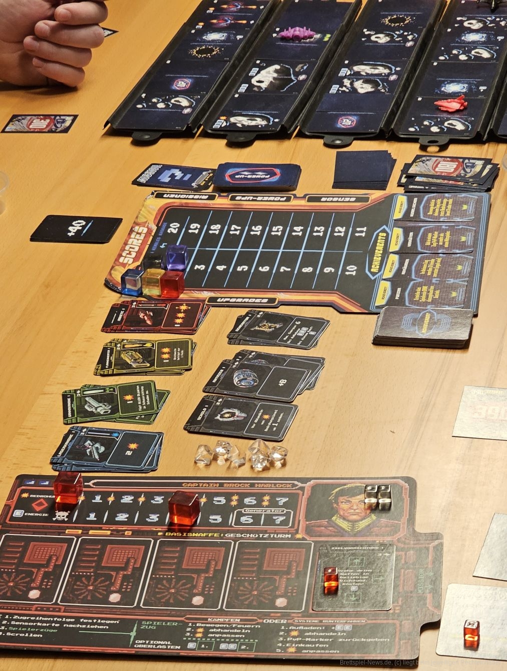 Zu Spielbeginn erhalten wir alle ein Schiff mit den gleichen Fähigkeiten. In unserem Spielzug können wir uns ein Mal bewegen und schießen. Wenn wir unser Schiff überlasten, können wir dies auch mehrfach tun, wenn wir die Konsequenzen dafür in Kauf nehmen. Wann wir am Zug sind, bestimmen unsere zuvor gespielten Sensor-Karten. Mit diesen bieten wir zum Start jeder Runde darauf, wann wir am Zug sind. Die niedrigen Karten haben dabei immer einen Bonus, der uns Vorteile für die Runde gibt.