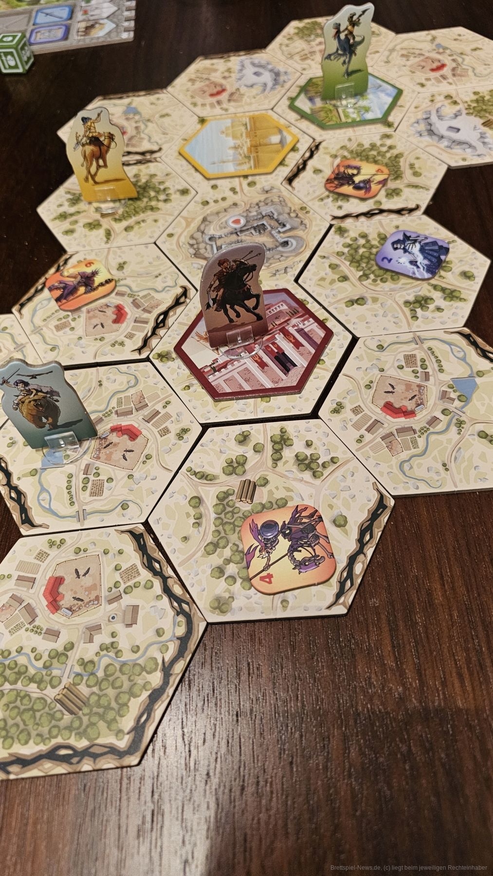 Grundsätzlich haben wir in unserem Zug 2 Aktionen, vor denen wir uns auch bewegen dürfen. Anfangs sammeln wir Ressourcen, um unsere Stadt zu gründen. Haben wir diese gebaut, können wir sie ausbauen und verschiedene Truppen ausbilden, die uns begleiten. Die Truppen werden durch Würfel dargestellt, welche wir dann im Kampf benutzen können.