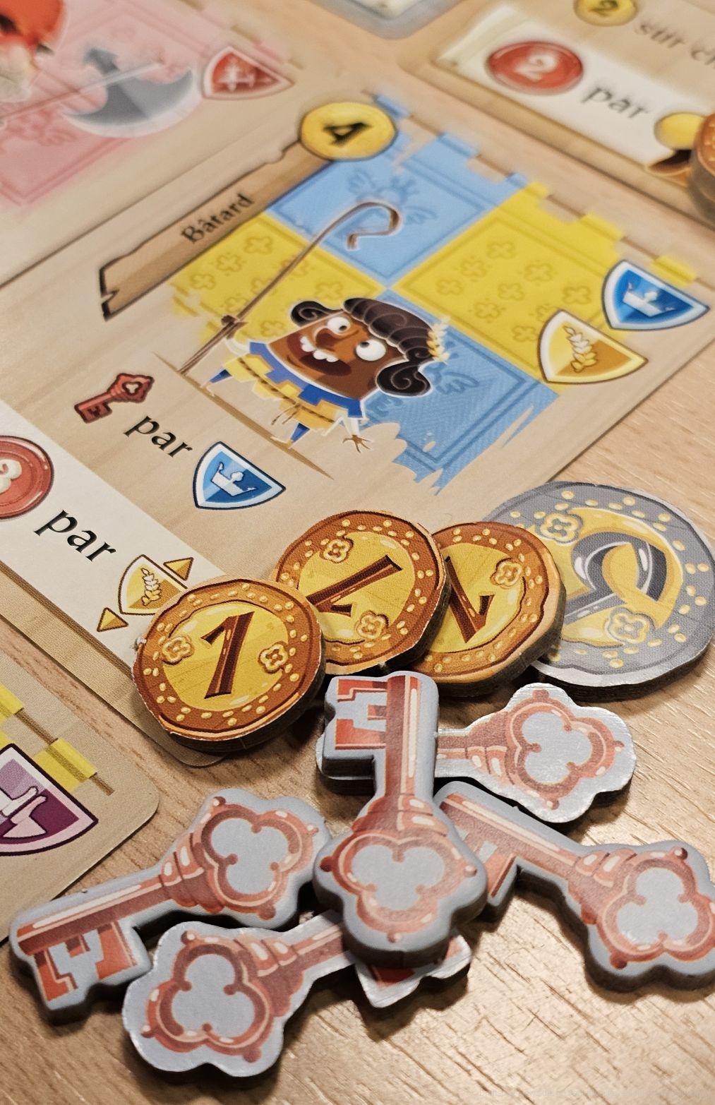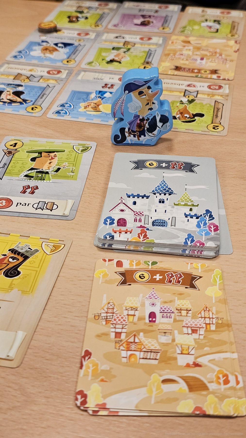 Jede Karte hat einen Soforteffekt und einen Effekt, der am Spielende Siegpunkte generiert. Das ist auch der spannende Teil von "Castle Combo". Die Wahl der Karte bestimmt die Menge der sofortigen Boni, was sehr taktisch ist. Der Ort, an den wir die Karte ablegen, bestimmt unsere Strategie. Jede Karte bezieht sich auf andere Karten in unserer Auslage. So bekommen wir zum Beispiel für jeden Adligen Punkte oder für gewisse Symbole, die benachbart zu einer Karte liegen.