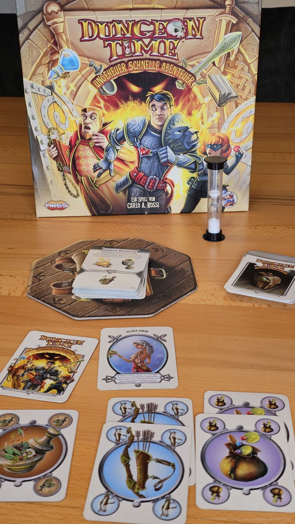 "Dungeon Time" ist ein kooperatives, sehr kommunikatives Echtzeit-Handmanagement-Spiel für 1-5 Personen ab 8 Jahren mit einer Spieldauer von ungefähr 15 Minuten, in dem wir versuchen, in 5 Minuten durch schnelles Ablegen von Karten, Aufträge zu erfüllen, die wir einzeln oder nacheinander in immer schwerer werdenden Szenarien spielen können.