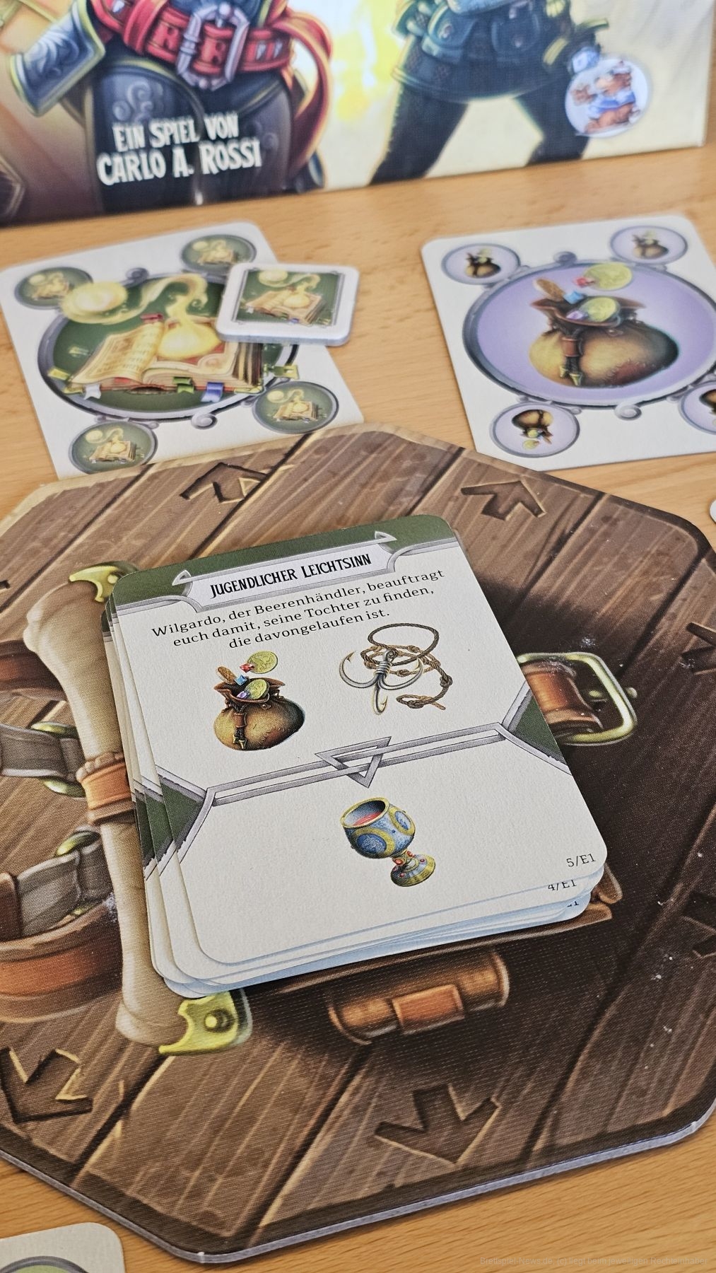 Zu Spielbeginn wählen wir ein Szenario. Dieses legt die Schwierigkeit und die im Spiel befindlichen Aufgaben fest. Zudem gibt es einen Einleitungstext für unser Abenteuer. Dann erhält jede Person Handkarten. Diese können Gegenstände oder Aufgaben zeigen.