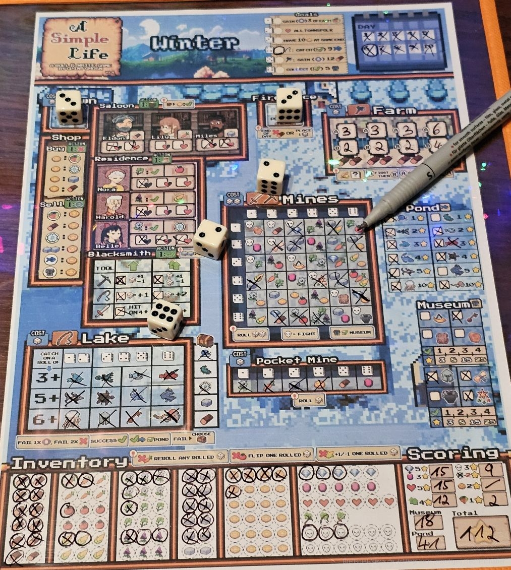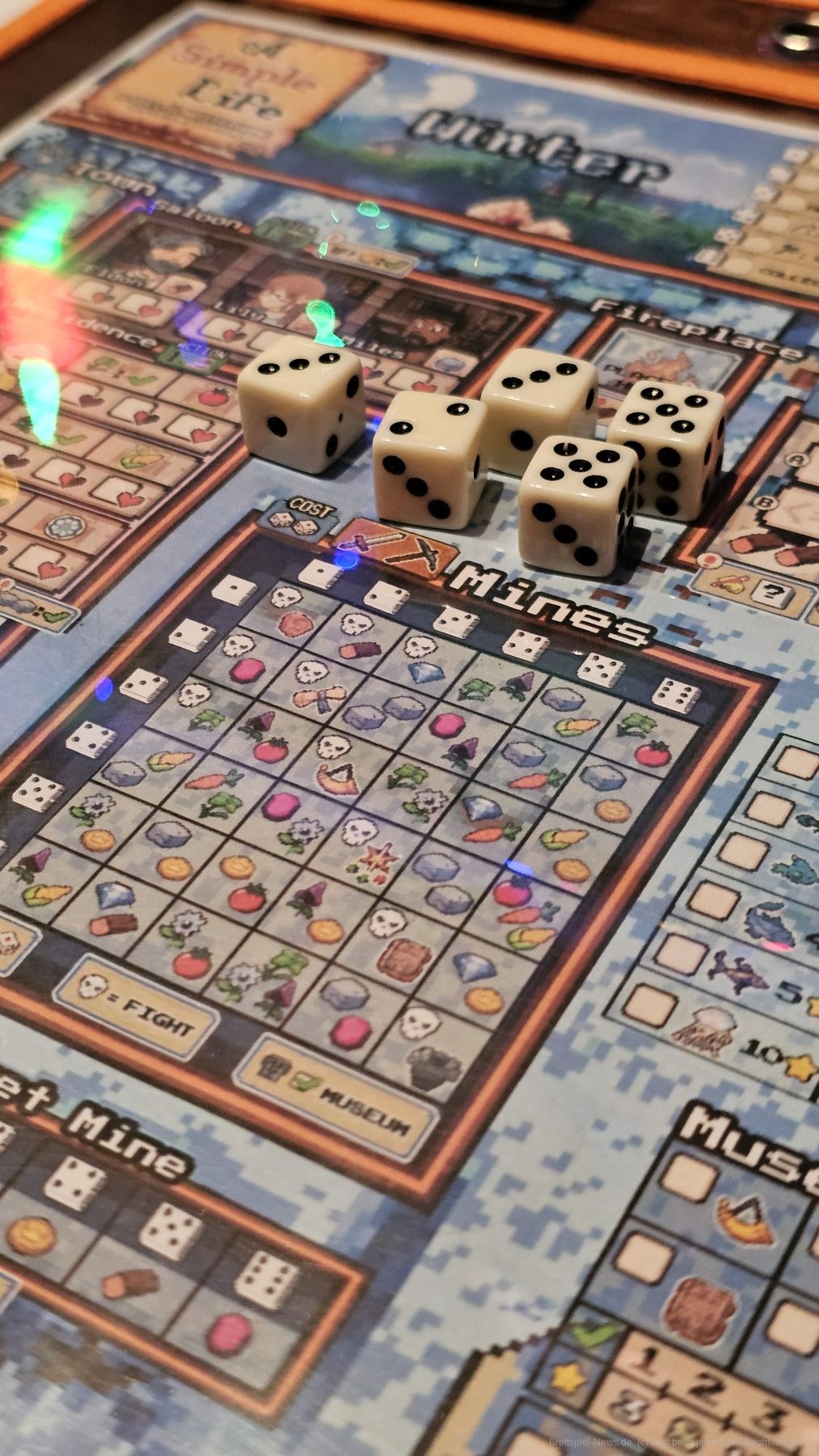 Wer sich den Spielplan ansieht, wird wahrscheinlich sofort an "Stardew Valley" denken. Das ist auch durchaus beabsichtigt, denn "A Simple Life" kondensiert "Stardew Valley" auf ein DIN A4-Blatt. Es hat sogar das "Stardew Valley" Brettspiel aus meiner Sammlung verdrängt.
