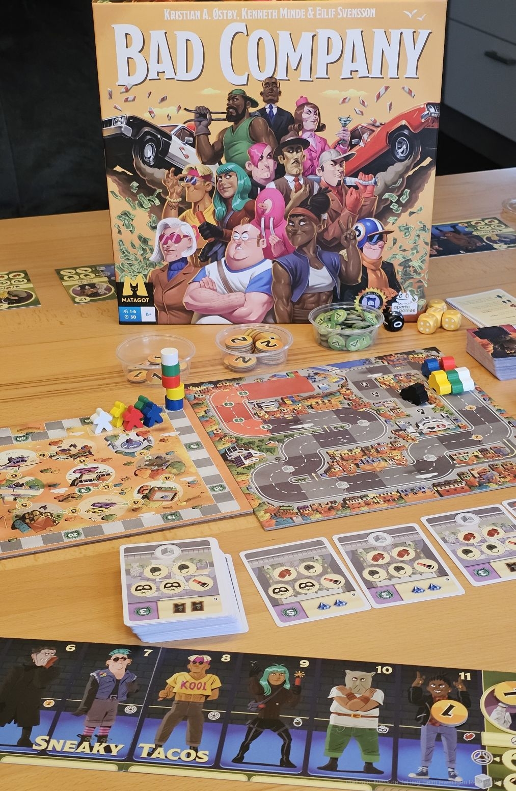 "Bad Company" ist ein Tableau-Building- und Set-Collection-Spiel für 1-6 Personen ab 8 Jahren mit einer Spieldauer von ungefähr 60 Minuten, in dem wir eine Räuberbande spielen, die vor der Polizei flieht und während ihrer Flucht noch so viele Raubüberfälle macht, wie es ihr möglich ist.