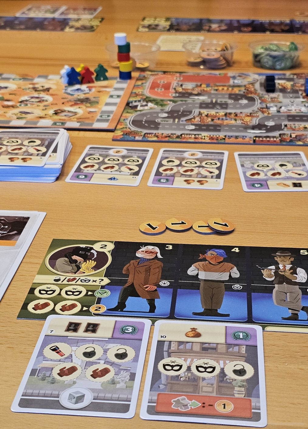 Unser Team aus Ganoven besteht aus 12 Mitgliedern, die alle eine Zahl und eine Fähigkeit haben. Die Fähigkeit lässt uns unser Auto vorsetzen, generiert Geld oder Symbole, die uns Raubüberfälle ermöglichen. Die Raubüberfälle haben Symbole, die wir durch die Fähigkeiten unserer Ganoven abdecken können. Sind alle Symbole abgedeckt, drehen wir den Überfall um und erhalten bei Spielende Siegpunkte. Die Überfälle können uns auch dauerhafte Fähigkeiten geben oder weitere Arten, bei Spielende zu punkten.