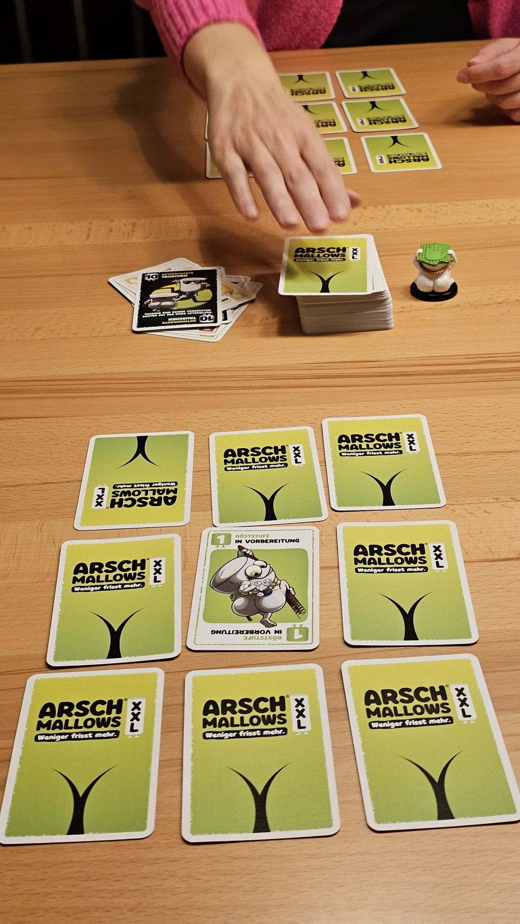 "Arschmallows XXL" ist ein Kartenspiel mit Memorymechanik für 1-8 Personen ab 8 Jahren mit einer Spielzeit von 10-15 Minuten pro Runde, in dem wir versuchen, die Marshmallows mit den wenigsten Röstaromen zu sammeln.