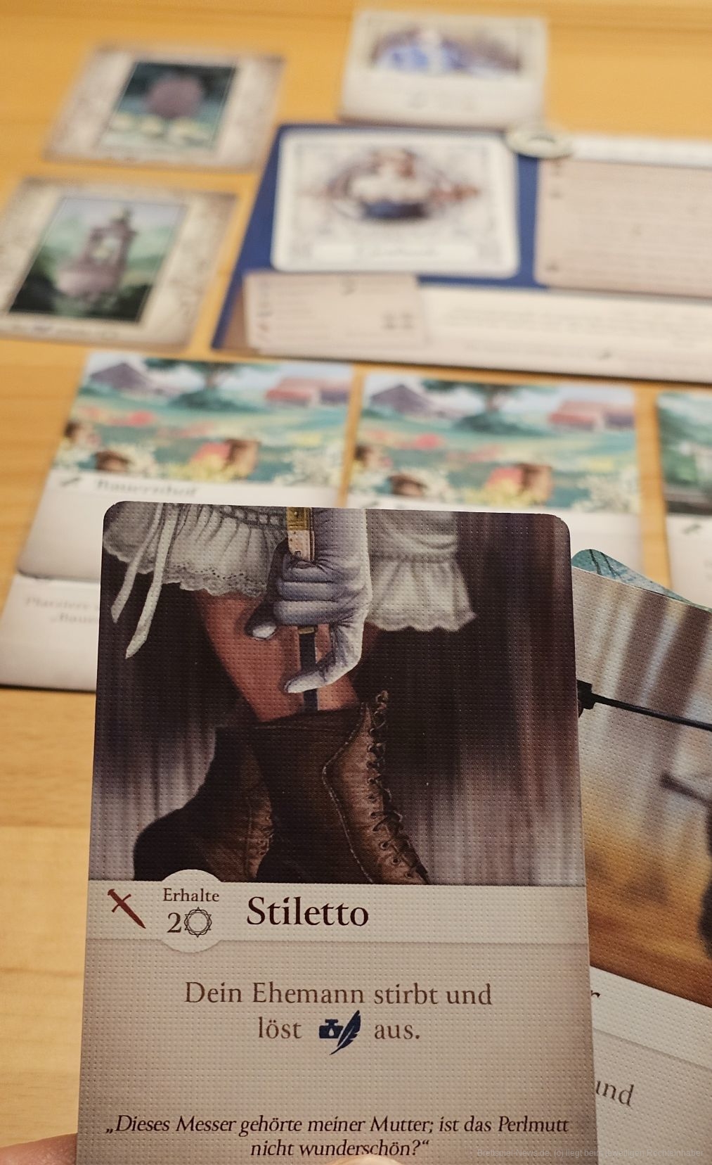 Nach dem Draft spielen wir alle gleichzeitig und unabhängig voneinander unsere Karten. So können wir Immobilien aufwerten oder unseren schlechten Ruf verbessern. Danach können wir versuchen, unseren geliebten Ehegatten mehr oder weniger subtil unter die Erde zu bringen. Je mehr Feingefühl der Mord hat, desto besser bleibt unser Ruf. Der Ruf ist wichtig, denn eine verrufene Witwe will niemand heiraten. Durch den Mord erben wir von Mann zu Mann immer mehr Geld und bekommen "Zugriff" auf reichere Männer. Irgendwann ist unser Vermögen soweit angestiegen, dass uns der Duke heiraten will, vorausgesetzt, unser Ruf ist nicht zu schlecht. Schaffen wir es, den Duke zu heiraten, gewinnen wir das Spiel.