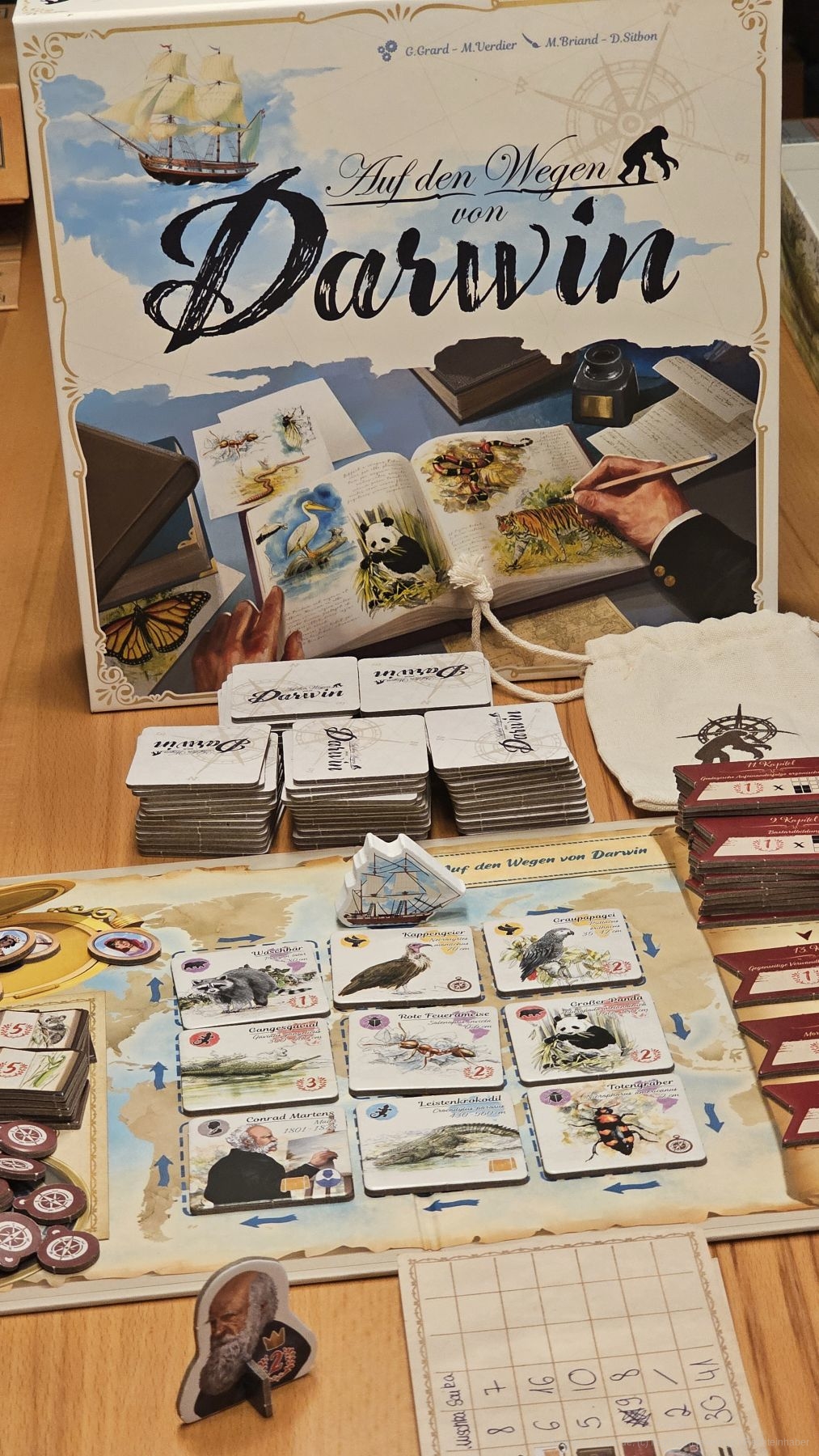 "Auf den Wegen von Darwin" ist ein außergewöhnlich hübsches Set-Collection-, Open-Drafting- und Pattern-Building-Spiel für 2-5 Personen ab 8 Jahren mit einer Spielzeit von 30-60 Minuten, in dem wir als Junior-Biologen und Biologinnen Charles Darwin auf der Beagle begleiten und ihm helfen, sein Werk fertigzustellen, indem wir Tiere katalogisieren.