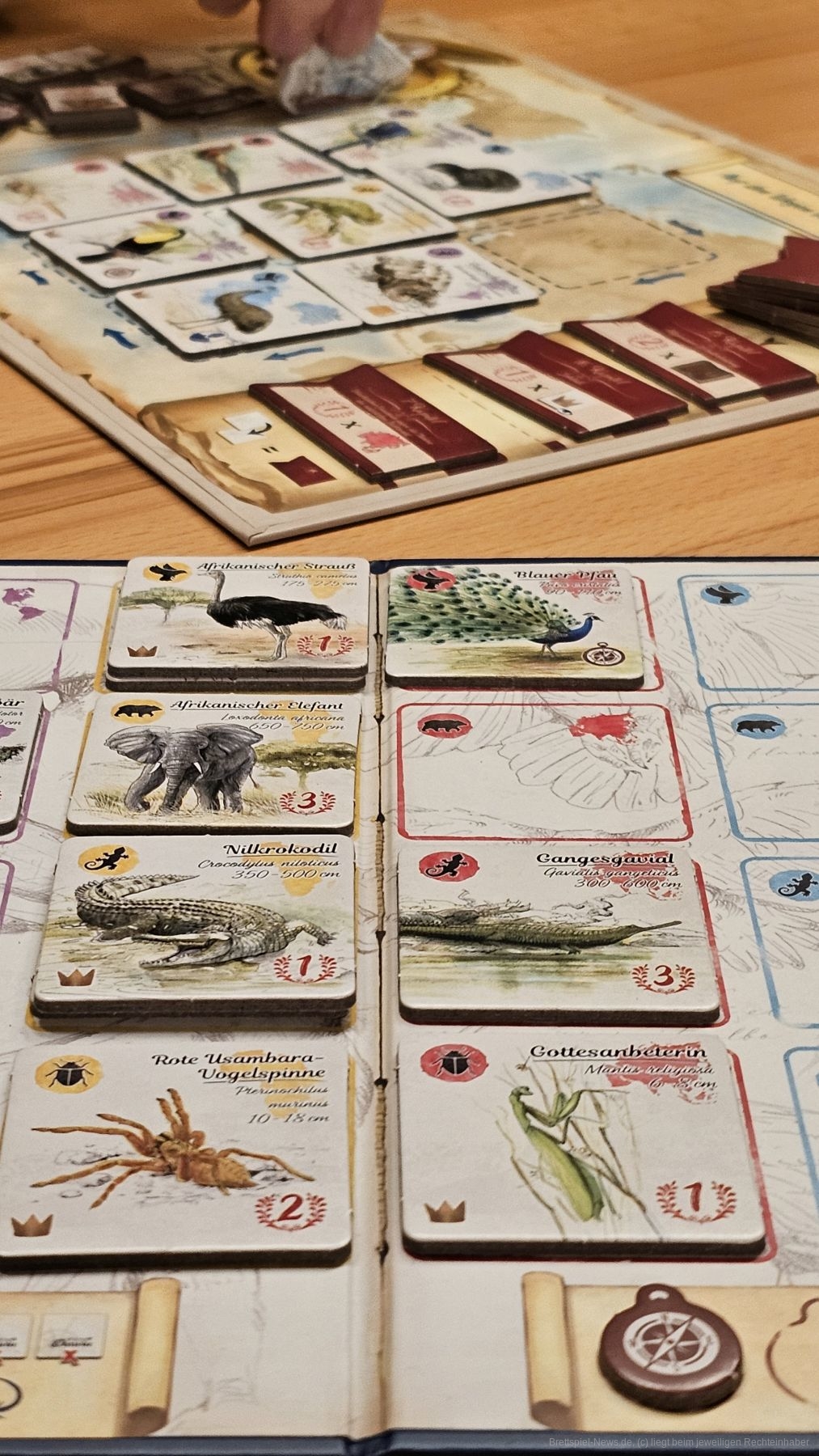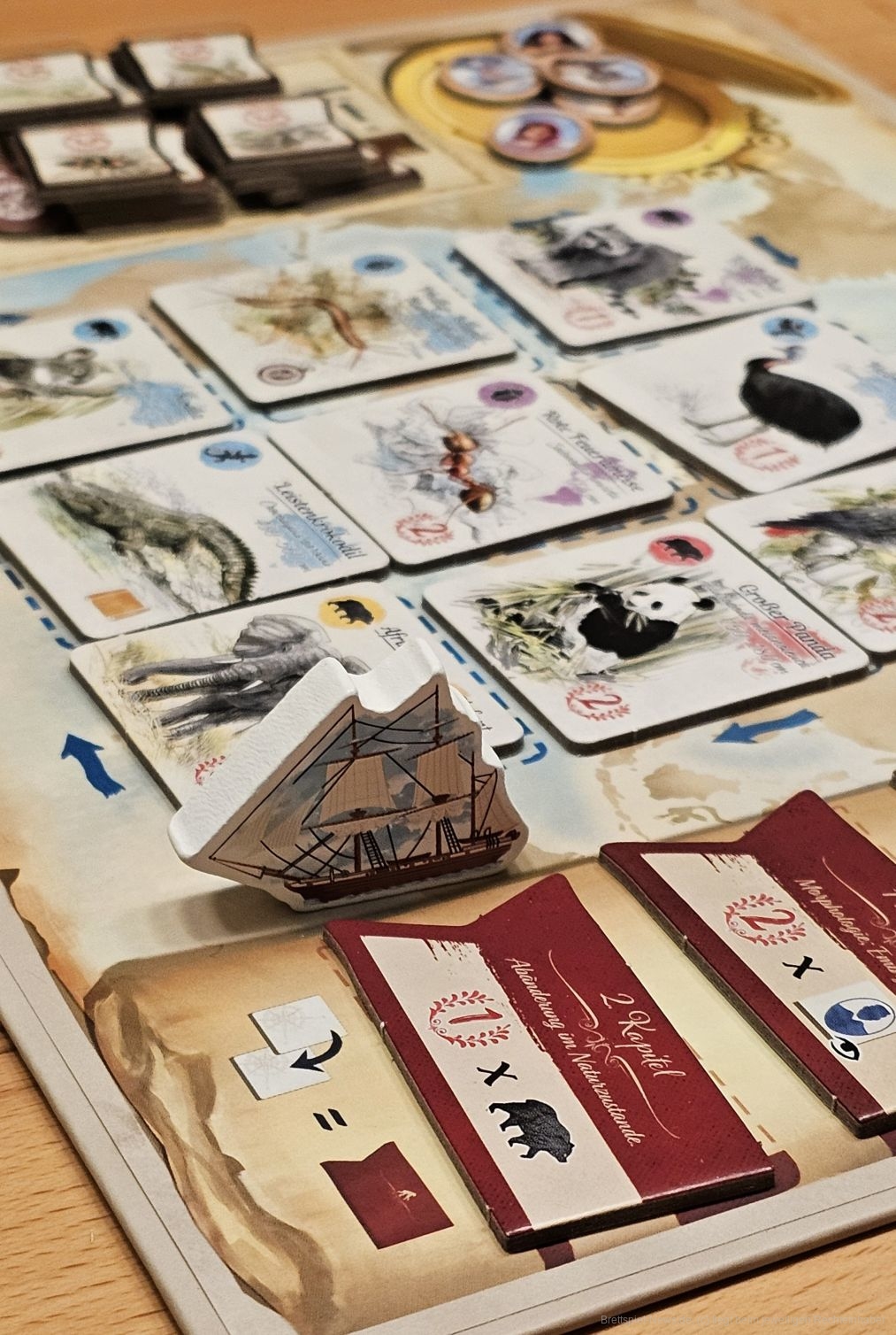 Vor uns liegt eine Ablage, die ein Raster bildet. Dieses Raster gibt Gattung und Herkunft eines Tieres vor, welches in das Raster gelegt werden kann. Sind wir am Zug, dürfen wir aus der Reihe oder Spalte, in der die Beagle steht, ein Tier nehmen. Danach fährt die Beagle weiter und wir legen das genommene Tier auf seinen festgelegten Platz im Raster. Tierplättchen haben Soforteffekte und Effekte, die wir erst am Spielende erhalten. So können wir zum Beispiel Ortskundige erhalten, die uns den Standort der Beagle manipulieren lassen oder Kompasse bekommen, die unsere Siegpunkte erhöhen.