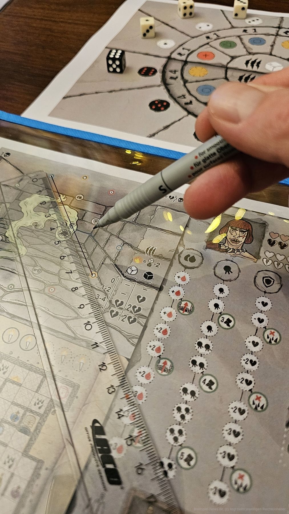 Ein gewählter Würfel bestimmt, wie weit wir laufen dürfen und von welchem Punkt aus wir eine Linie zu einem anderen Punkt über das Monster ziehen dürfen, welches uns im Dungeon verfolgt. Zudem bestimmt er die Angriffskraft des Monsters. Hier zeigt sich die Besonderheit des Spiels, denn anstatt zu würfeln, müssen wir das Monster mit räumlichem Denken besiegen.