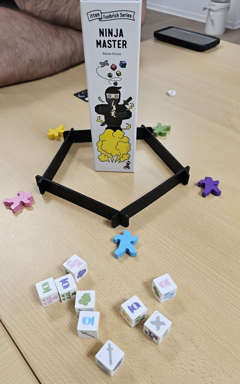 "Ninja Master" ist ein Reaktionsspiel für 2-5 Personen mit gut geschnittenen Fingernägeln ab 8 Jahren mit einer Spieldauer von ungefähr 10 Minuten, in dem wir versuchen, so schnell wie möglich die ertragreichsten Waffen und Ninjas vom Tisch zu schnappen.