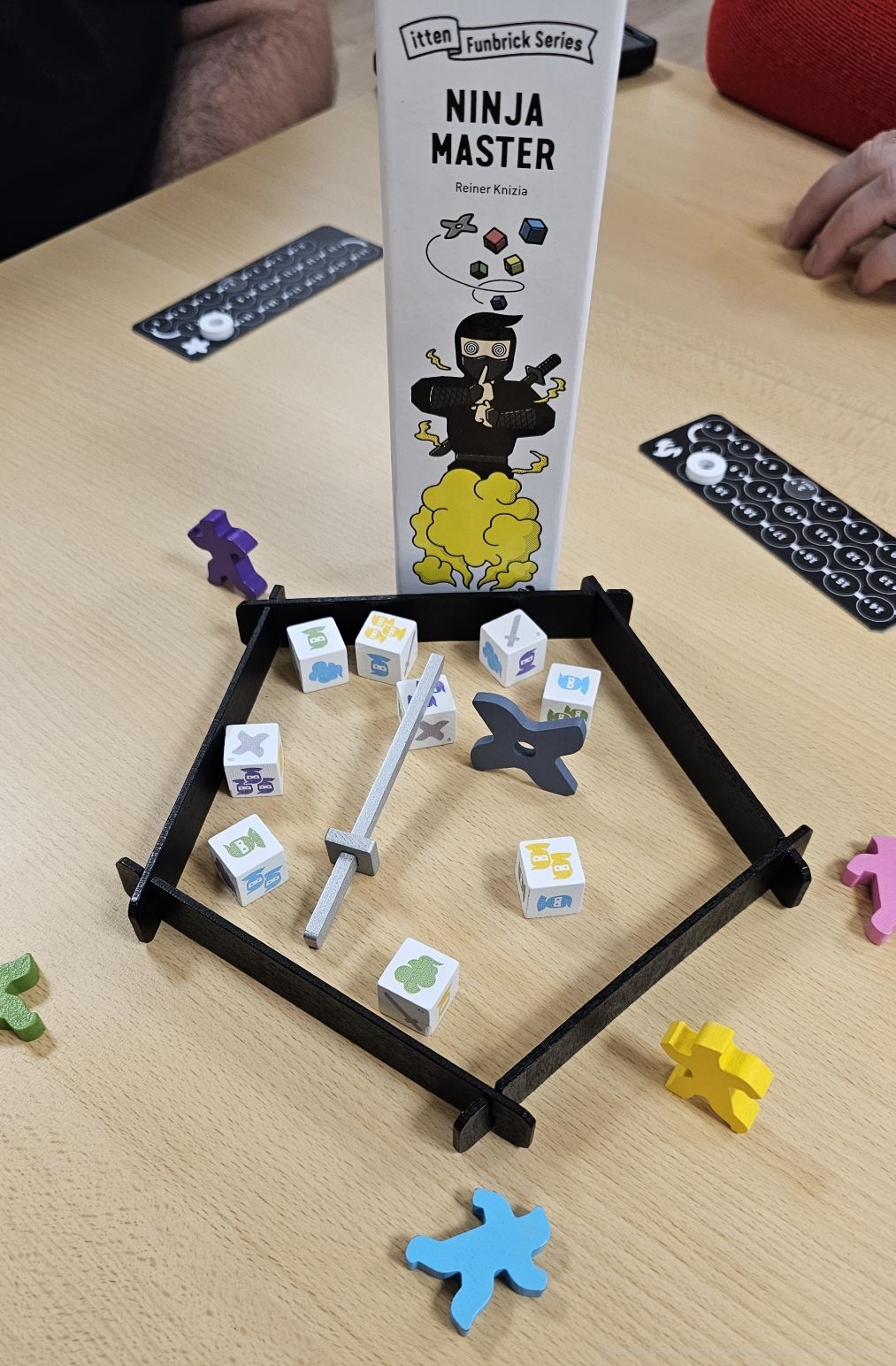 Dort liegen Figuren in verschiedenen Farben und ein Schwert. Die Person, die die Würfel geworfen hat, erhält unabhängig von ihren genommenen Gegenständen einen Punkt für jeden geworfenen Ninjastern.