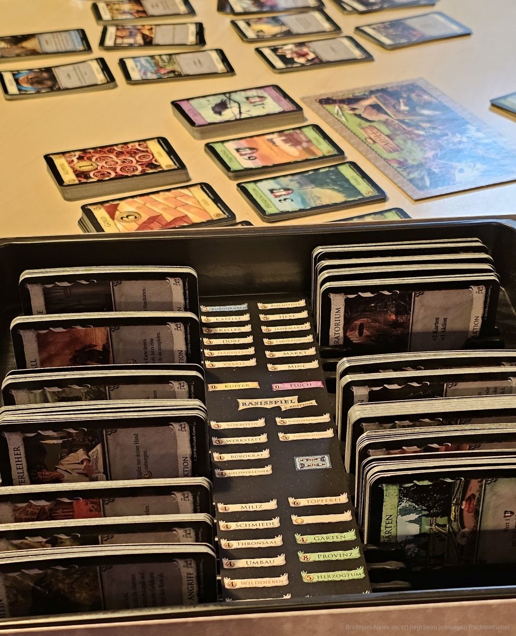 Das Spiel kommt mit vielen Karten-Sets, die wir beliebig untereinander variieren können. Dadurch ändert sich die Auslage, aus der wir kaufen können und somit auch die Möglichkeiten, die wir im Spiel haben. So lassen sich von Spiel zu Spiel andere Taktiken anwenden und generell schafft "Doninion" so Abwechslung.