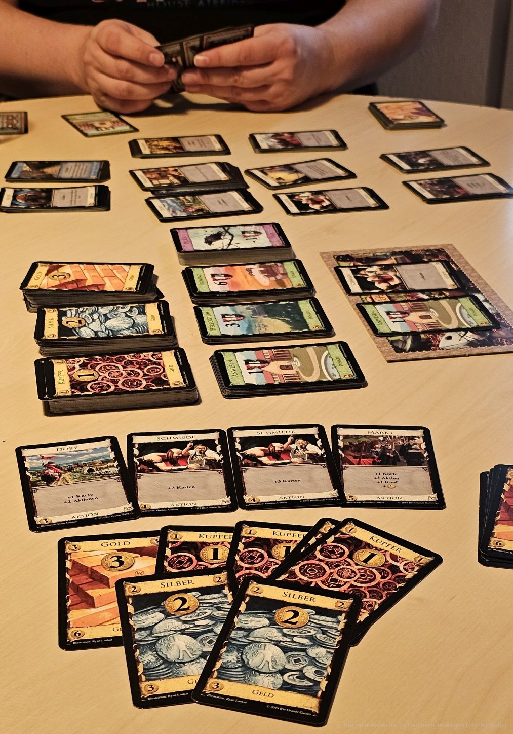 In unserem Spielzug haben wir grundsätzlich eine Aktion und einen Kauf. Die Aktionen lassen uns Geldkarten aufwerten, mehr Karten ziehen und schaffen so zusätzliche Aktionen oder Geld. Manche Karten greifen die anderen Personen am Tisch aber auch an oder blocken Angriffe ab. Mit dem Geld kaufen wir Karten aus der Auslage.