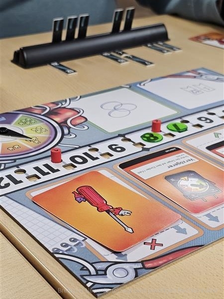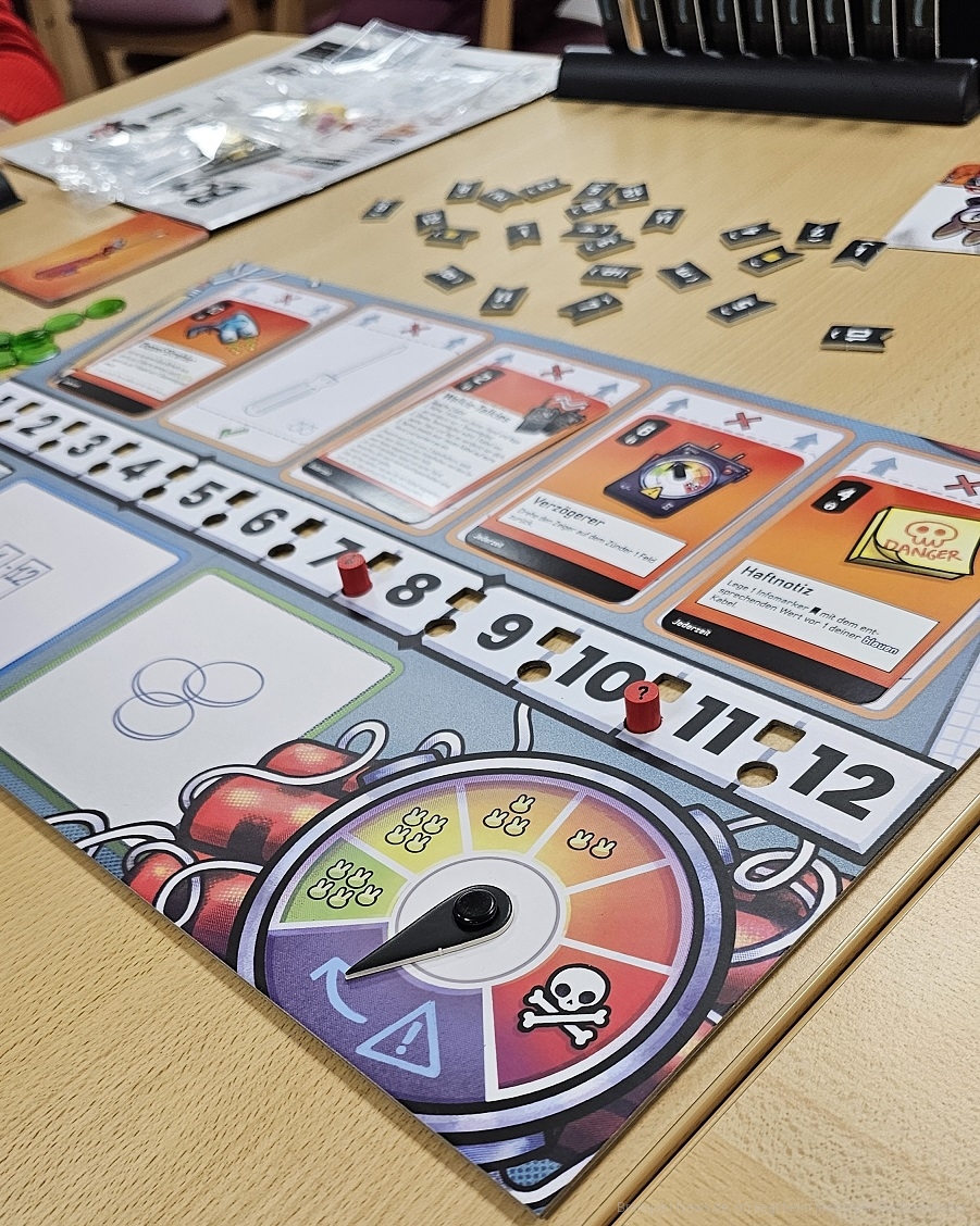 Jede Person erhält einen Aufsteller, in den Plättchen aus Pappe gesteckt werden, die die Drähte der Bombe darstellen. Wir dürfen nur die eigenen Drähte sehen. Diese haben einen bestimmten Zahlenwert und sind von links nach rechts aufsteigend sortiert. Einen Draht dürfen wir zu Spielbeginn für alle sichtbar markieren, sodass alle wissen, welche Zahl sich hinter diesem Plättchen verbirgt. Schon dabei beginnt die Deduktion, denn welche Zahl wir markieren kann den anderen Personen am Tisch wichtige Hinweise bringen.
