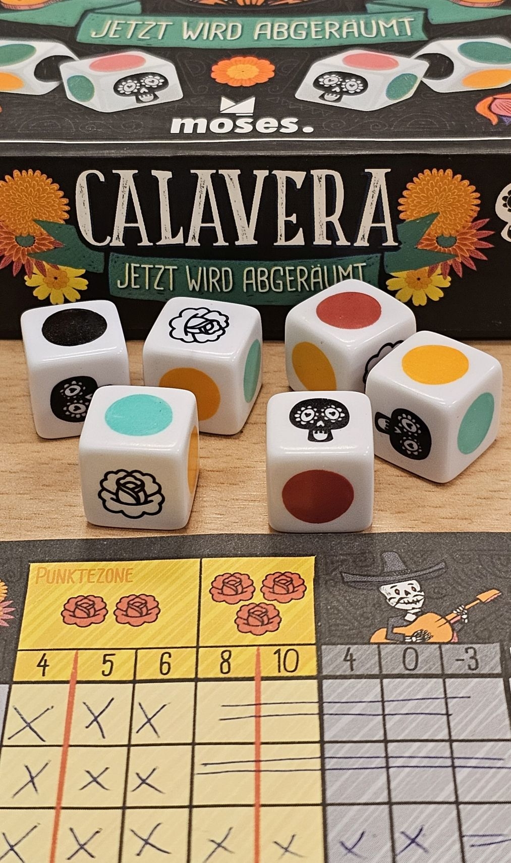 "Calavera" ist ein Push-Your-Luck-Würfelspiel für 2-4 Personen ab 8 Jahren mit einer Spieldauer von ungefähr 20 Minuten, in dem wir versuchen, den richtigen Zeitpunkt zu finden, um uns Punkte zu sichern.