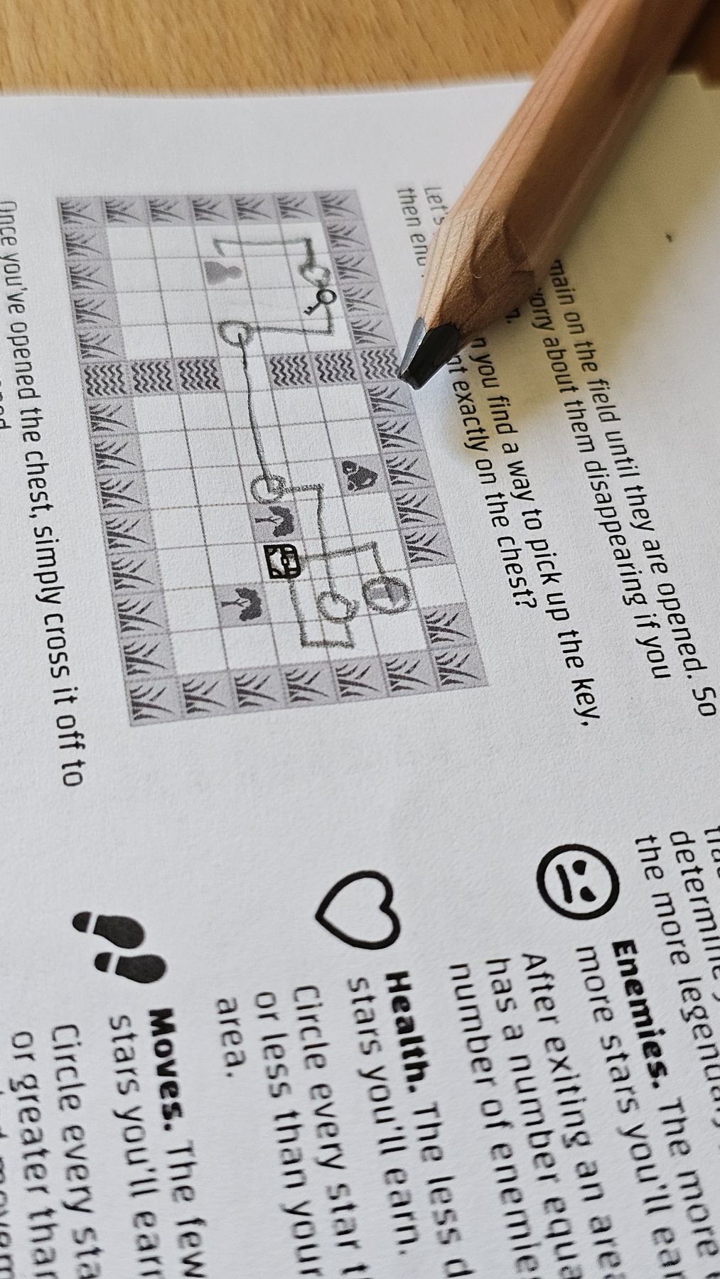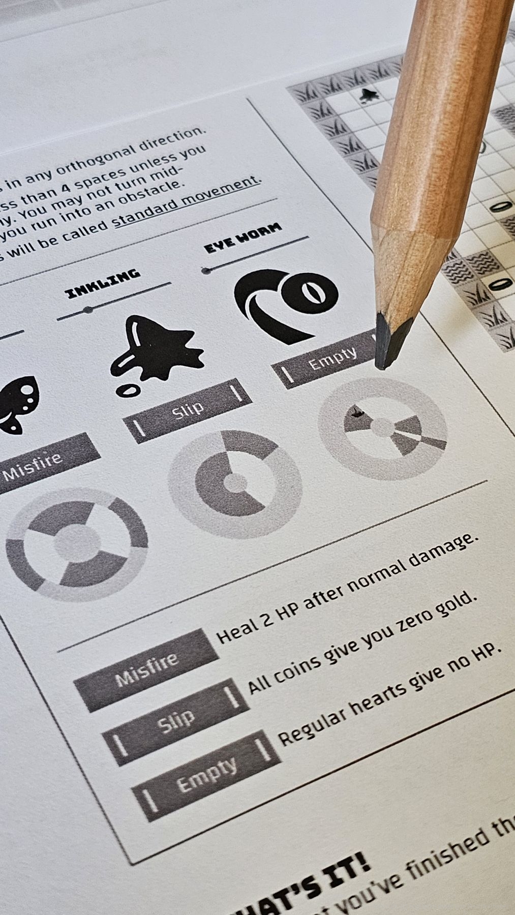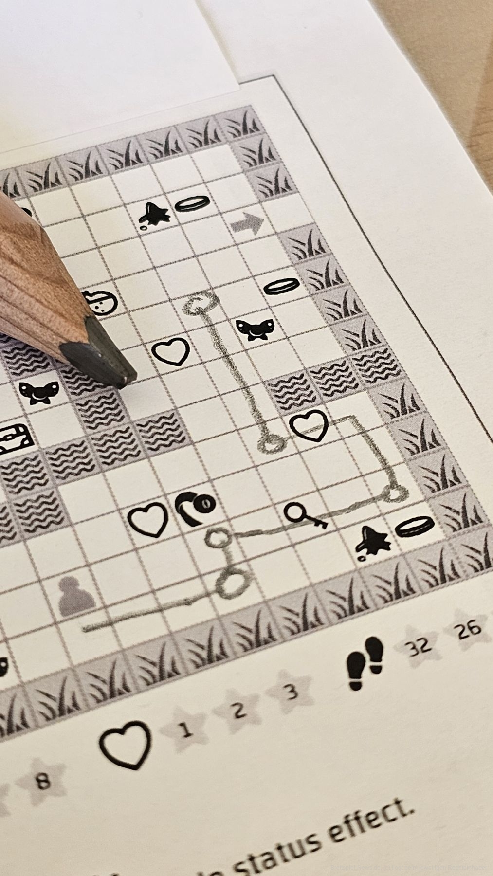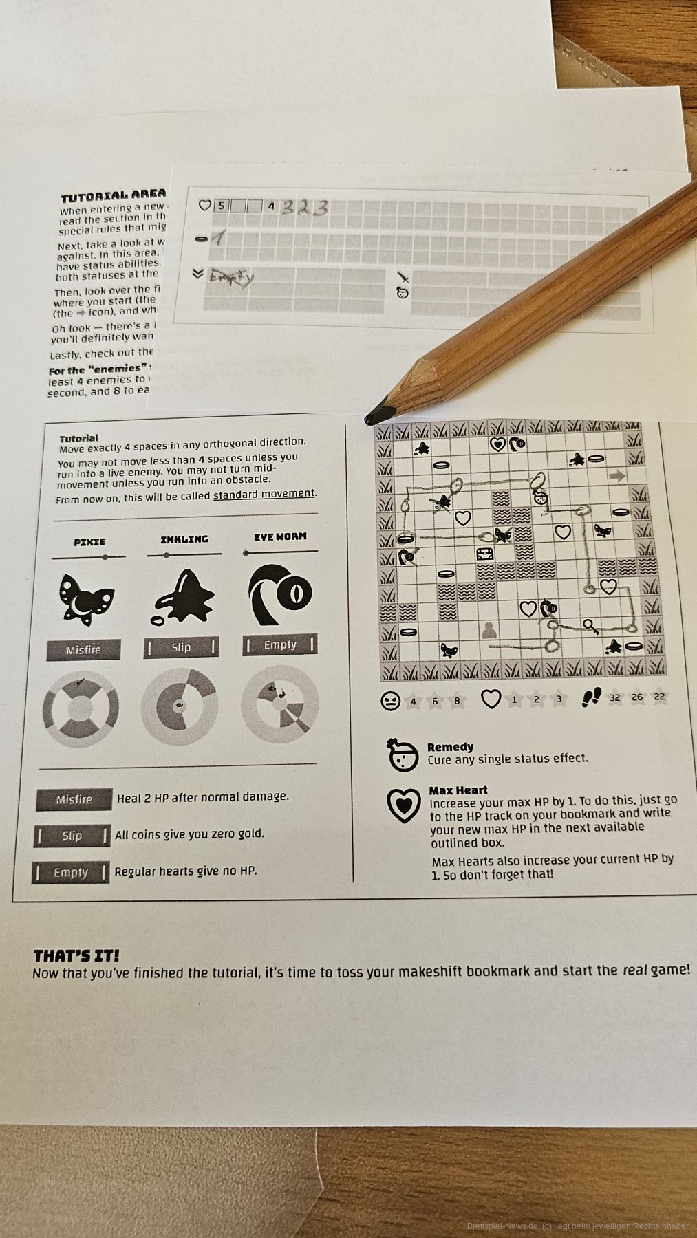 "Pencil Book Quest" hebt sich von den meisten „… and write-Spielen" ab, weil wir hier nichts flippen und auch keine Würfel werfen. Es kann aktuell auf kickstarter.com als physikalische und Print-and-Play-Version unterstützt werden. Auf der Seite findet ihr ein Tutorial, das euch Schritt für Schritt in das Spiel einführt und am Ende ein vollständiges Level bietet.