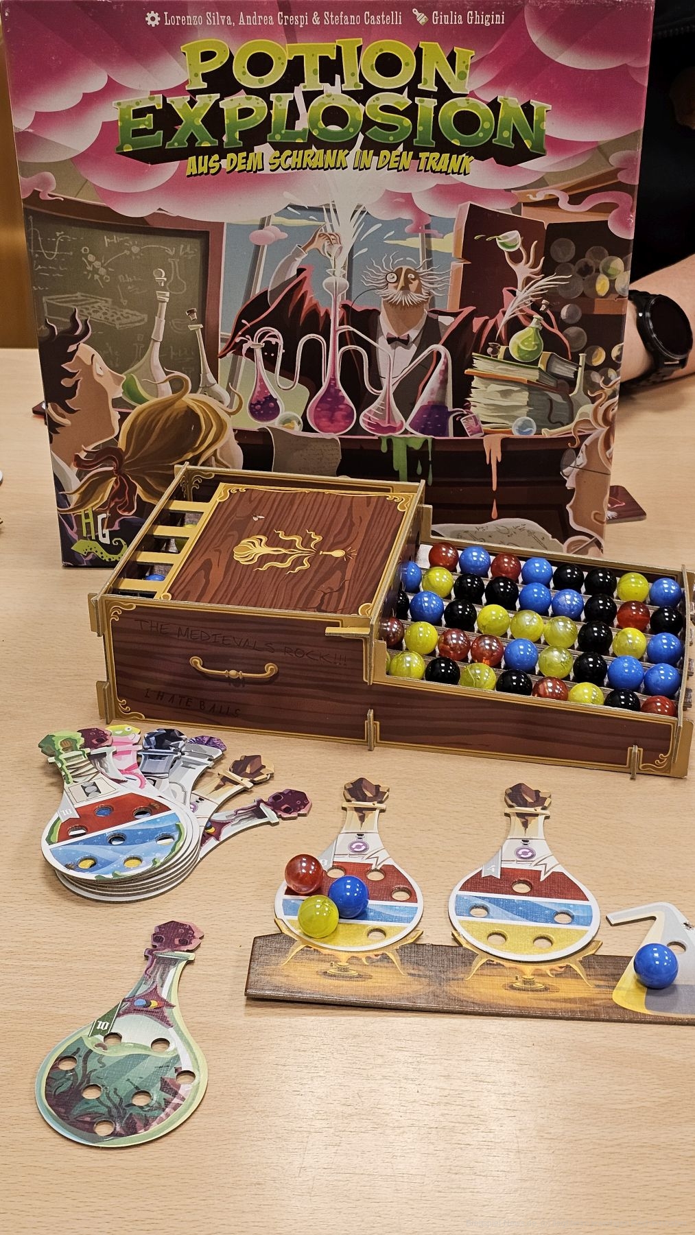 "Potion Explosion" ist sehr einfach designt. Durch den Kugelspender und die Zutatengewinnung in Form von Kettenreaktionen kommt allerdings ein tolles haptisches und auch spielmechanisch interessantes Spiel heraus, welches ich auch heute noch empfehlen kann.