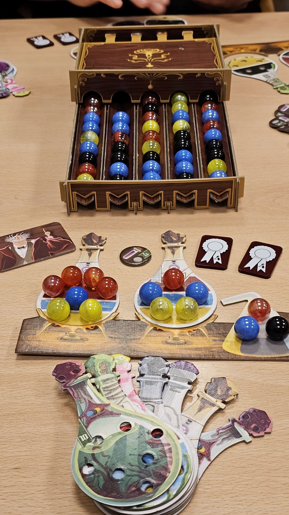Haben wir die uns zustehenden Kugeln genommen, legen wir sie auf unsere Tränke. Hat ein Trank dadurch alle benötigten Zutaten erhalten, werden die darauf liegenden Kugeln wieder in den Spender geschmissen und der Trank umgedreht. Dieser verleiht uns eine spezielle Fähigkeit. Zum Beispiel dürfen wir nun einmal 2 benachbarte Kugeln aus dem Spender nehmen. Analysieren wir also gedanklich gut den Spender und nutzen unsere Tränke weise, können wir sehr viele Zutaten in einem Zug erhalten.