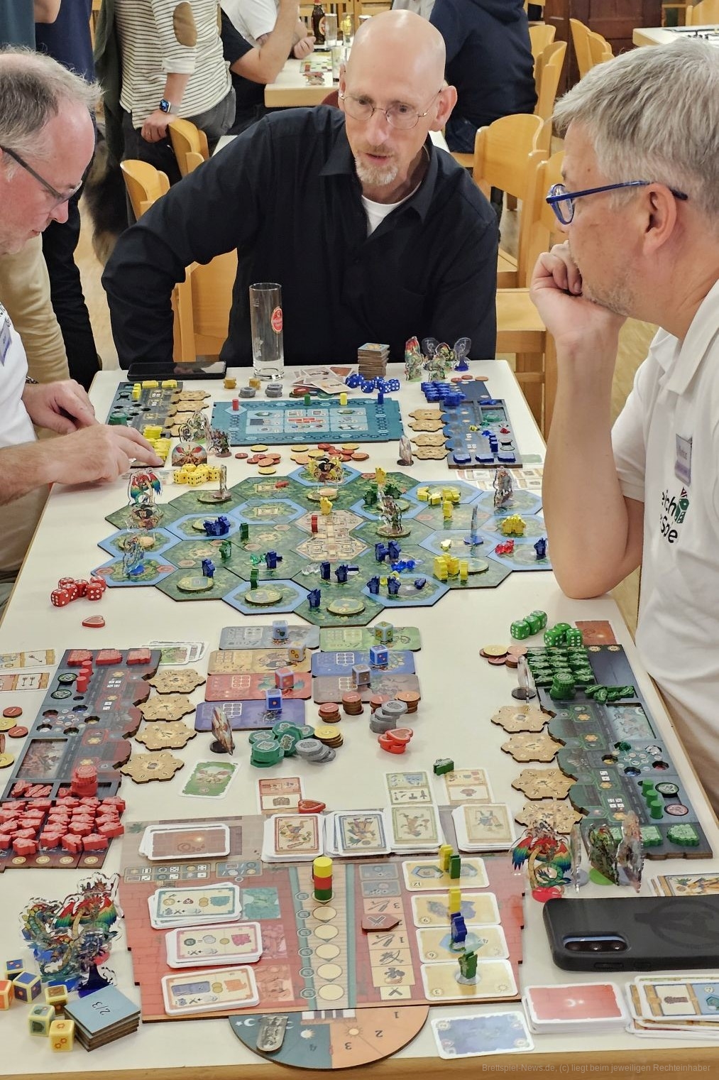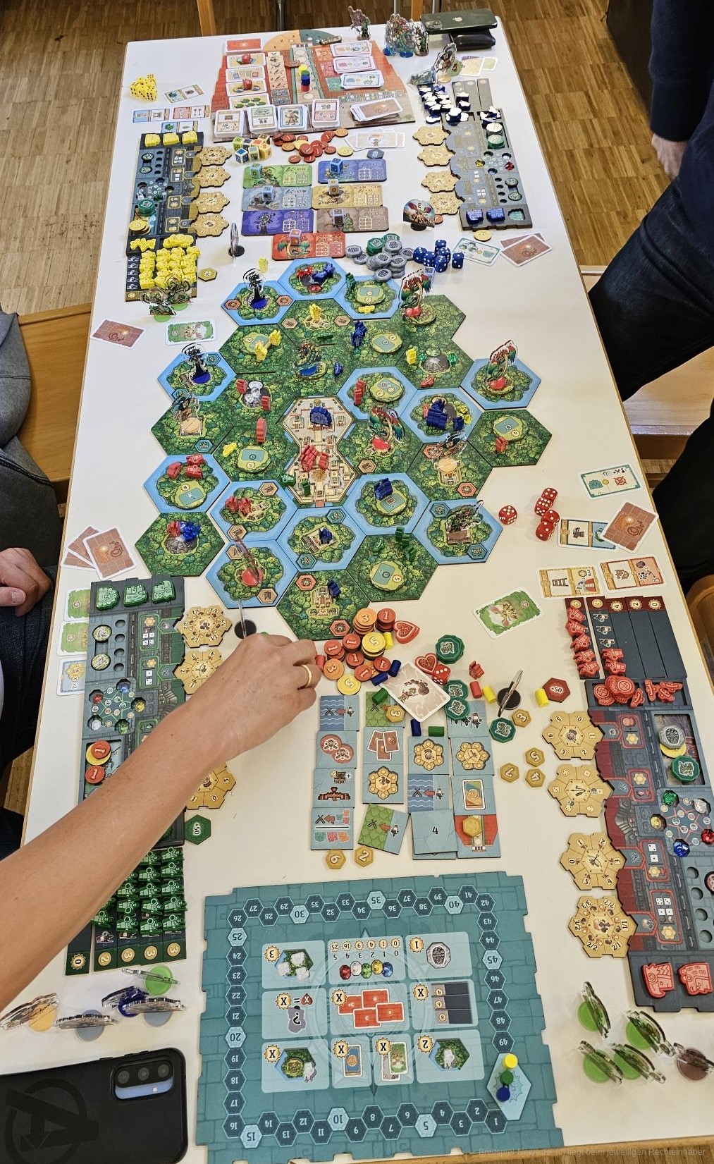 Die größte Hürde ist nicht unbedingt die Regelerklärung, die etwa 45 Minuten einnimmt, es ist eher die harte Konfrontation, die das Spiel nicht zwingend forciert, aber oft genug fordert. Es ist nicht jedermanns Sache, direkt gegen die Mitspielenden vorzugehen. Allerdings entsteht hier auch der größte Reiz, die höchste Spannung. Denn meistens geht es bei den Kämpfen um Gebiete oder Edelsteine. Hier können nach einem Kampf extreme Differenzen in den Siegpunkten entstehen. So habe ich nach einem verlorenen Kampf durch verschiedene Bedingungen, die eingetreten sind, 18 Siegpunkte verloren. Das ist mehr, als eine Person im ersten Spiel bei Spielende überhaupt hatte. Es ist aber auch möglich, über 100 Punkte zu kommen.