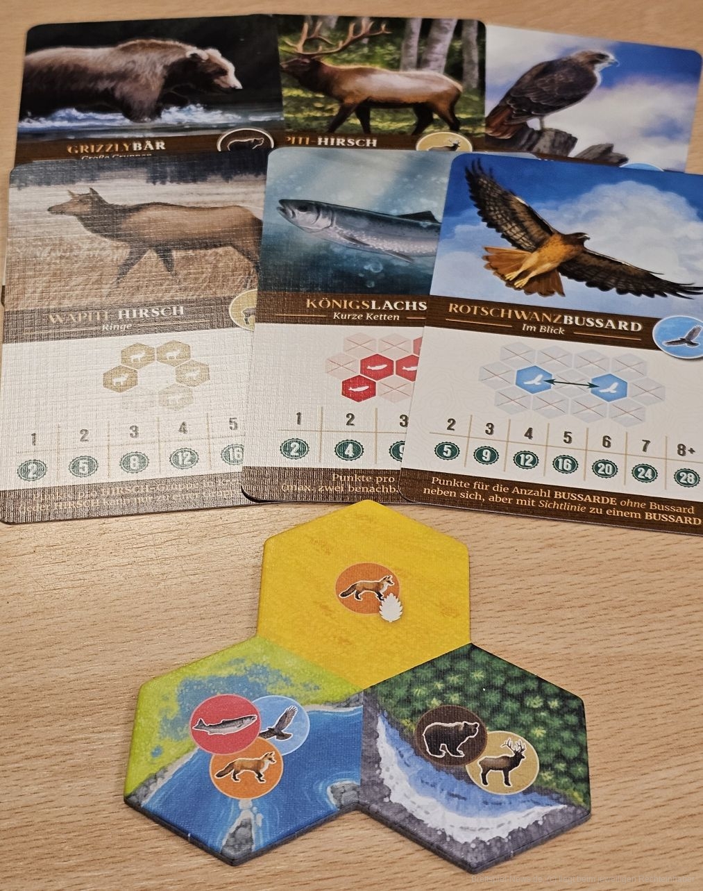 Zu Spielbeginn liegt bereits eine kleine Landschaft aus 3 zusammenhängenden Plättchen vor uns. In der Tischmitte liegen immer vier Paare aus einem Landschaftsplättchen und einem Tier. In unserem Zug müssen wir ein Paar aus Tier und Plättchen nehmen. Das Plättchen muss angelegt werden, das Tier darf auf eine zum Tier passende Landschaft gelegt werden. Dadurch erhalten wir manchmal Tannenzapfen, die uns beim Wählen von Tier und Plättchen mehr Variation geben.