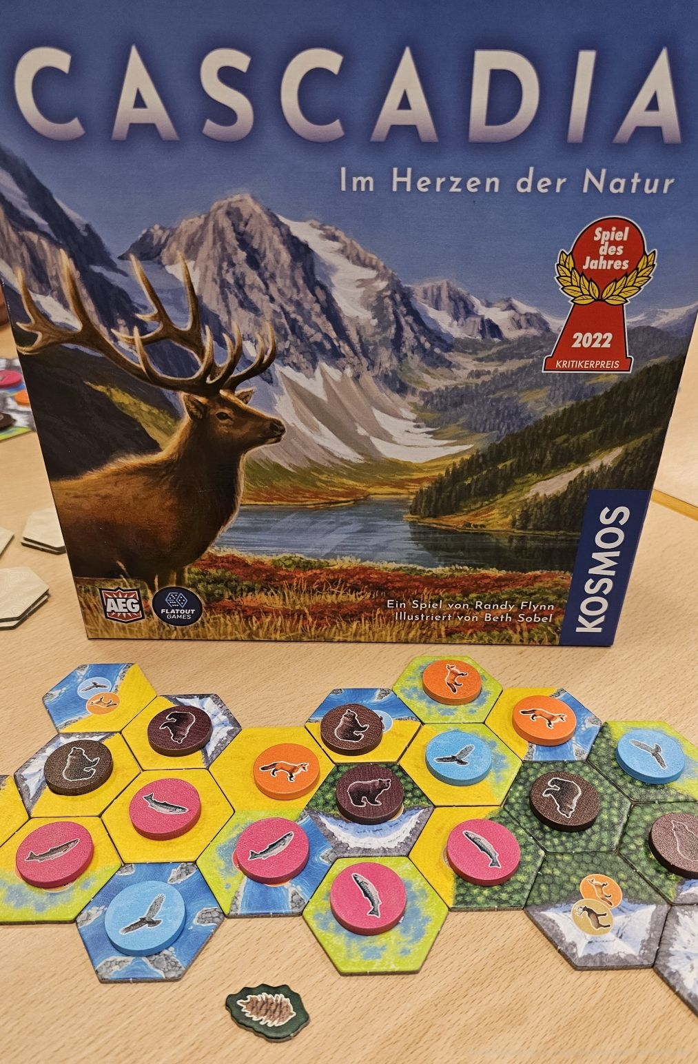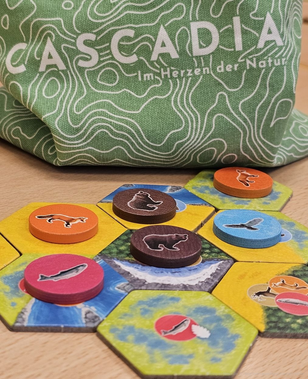 "Cascadia" ist ein Plättchen-Legespiel mit offenem Draft für 1–4 Personen ab 8 Jahren, mit einer Spieldauer von 45–60 Minuten, in dem wir eine Landschaft auslegen und mit Tieren bevölkern.
