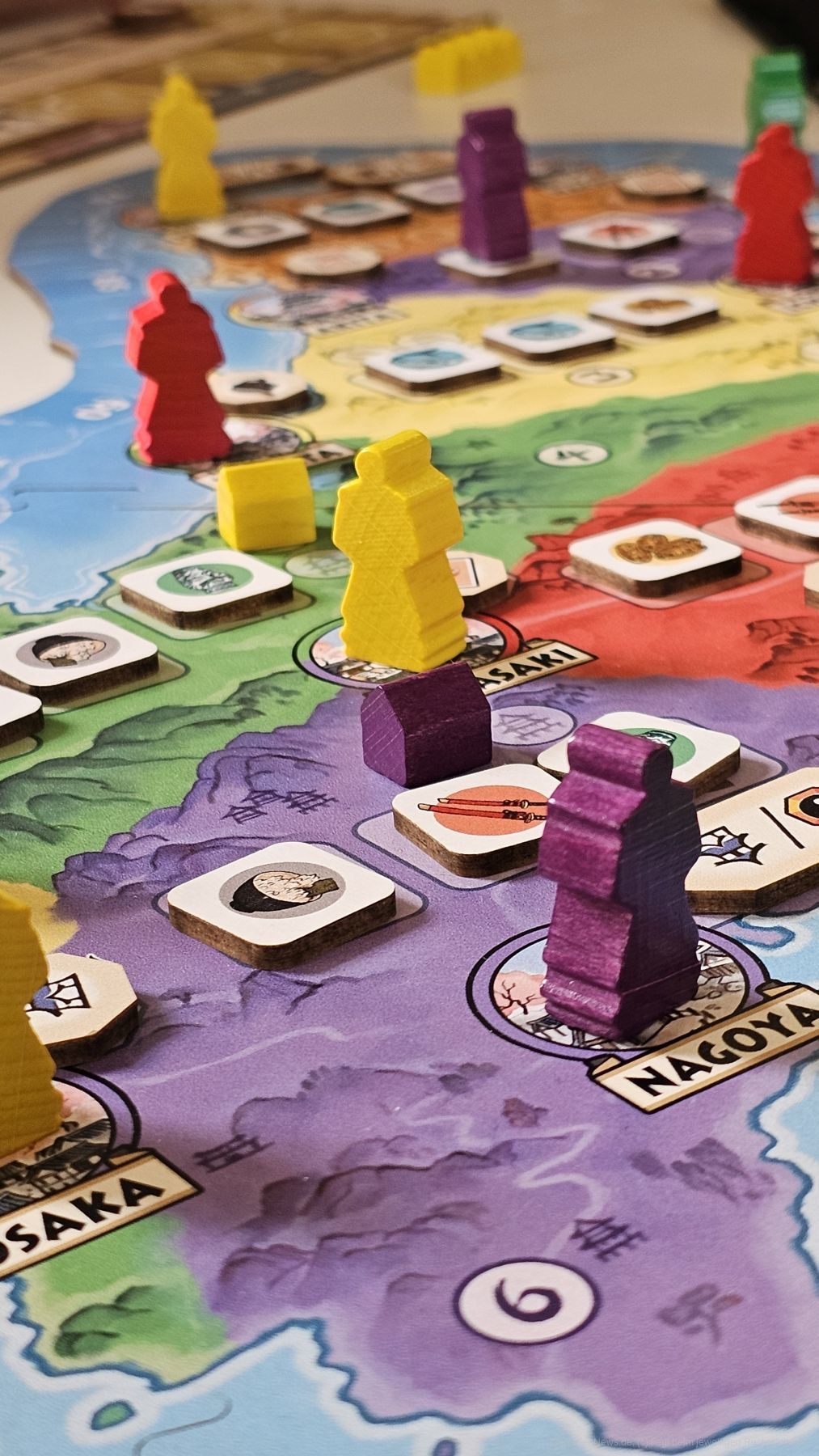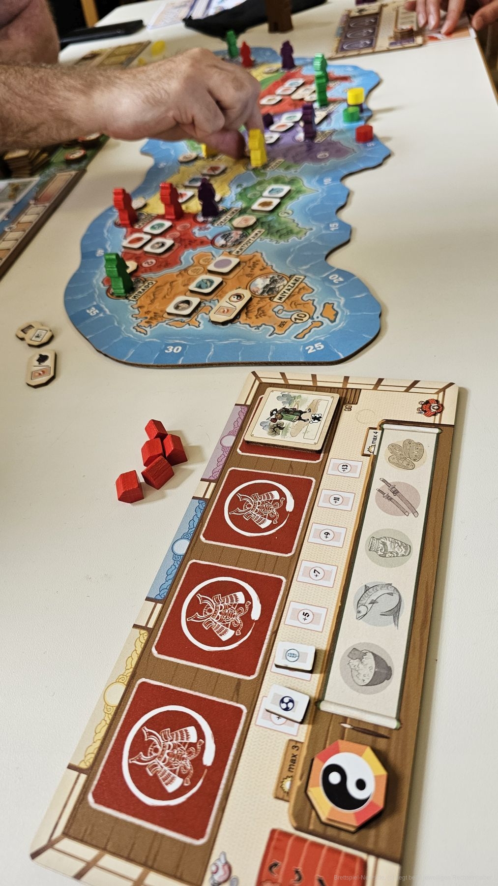 Auf unserem Tableau stehen einige Ronin, die auf Städte der Landkarte von Japan eingesetzt werden wollen. Wir setzen sie reihum einen nach dem anderen und üben somit Einfluss auf die angrenzenden Gebiete aus. Mit dem Einsetzen triggern wir eine Aktion, die uns auf verschiedenste Weise Vorteile bieten kann.