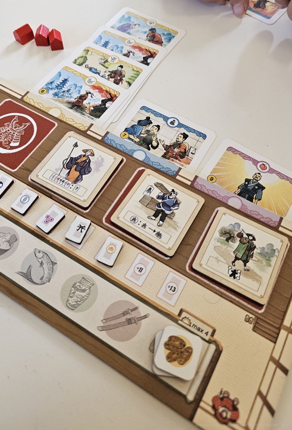 So können wir auf der Teeleiste voranschreiten, was uns bei Gleichständen hilft. Wir können Flaggen sammeln, die immer mehr Siegpunkte geben, je mehr wir davon haben. Unsere Samurai können Spezialfähigkeiten und Aufträge erhalten, Häuser bauen oder einfach einen Yin-Yang-Chip erhalten, der Ressourcen ersetzt.