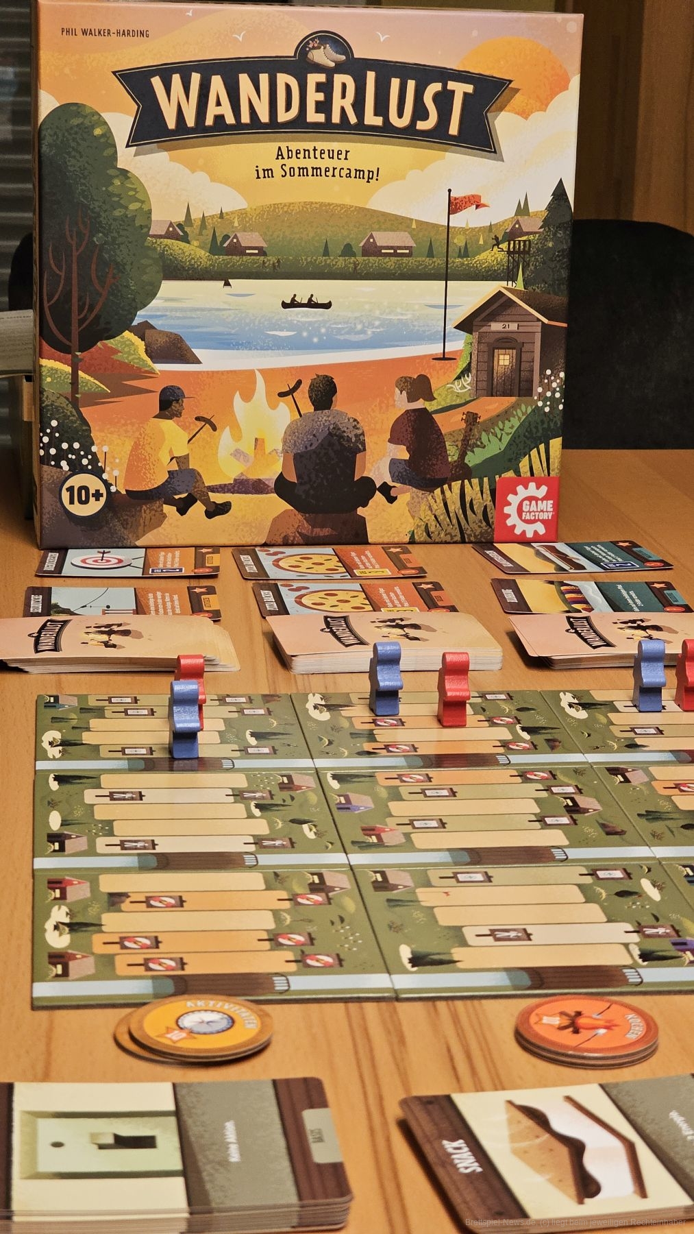 "Wanderlust" ist ein Wettlauf-Deckbau-Spiel für 2–4 Personen ab 8 Jahren mit einer Spielzeit von 30–45 Minuten, in dem wir versuchen, unsere Figuren auf drei Strecken schnell nach vorne zu bringen.