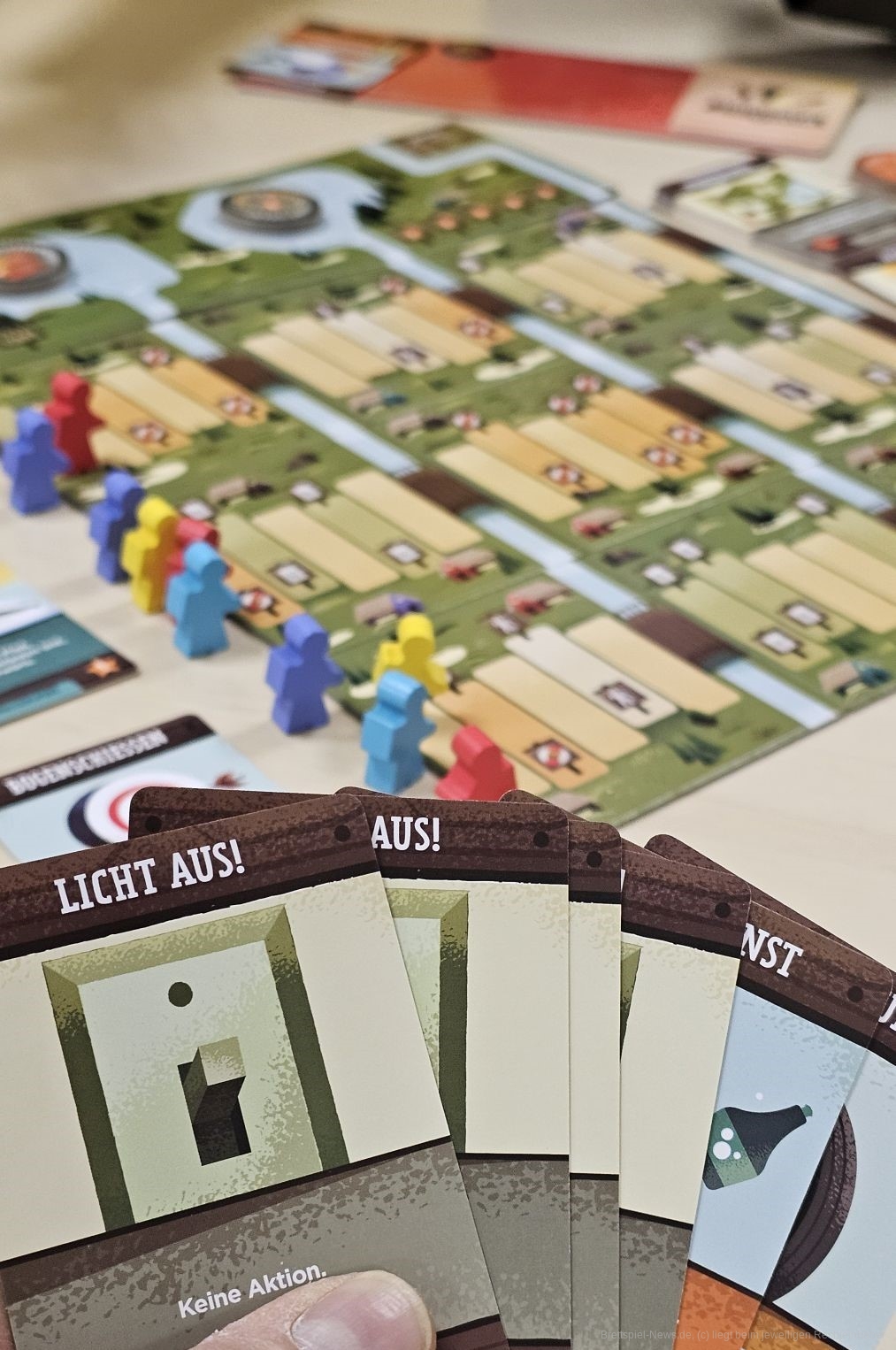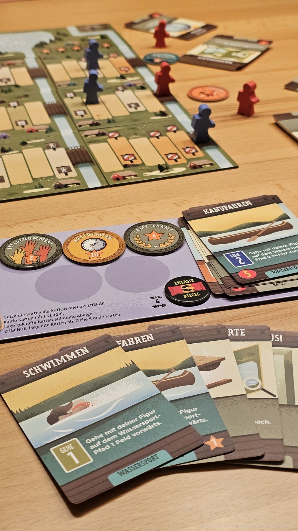 Wie in jedem Deckbauspiel kaufen wir neue Karten von den Decks. Das sollten wir recht ausgewogen tun, denn wir wollen alle Wanderer nach vorn bringen. Setzen wir einen Fokus zu stark auf eine der drei Wanderrouten, kann es sein, dass sich unsere anderen Wanderer später schwer bewegen lassen. Schließlich sind Karten einer abgeschlossenen Route im späteren Spielverlauf nur noch hinderlich auf der Hand. Wer zuerst gewisse Wegpunkte erreicht, erhält Bonuspunkte. Zudem können die Felder, auf denen wir landen, positive Effekte haben.