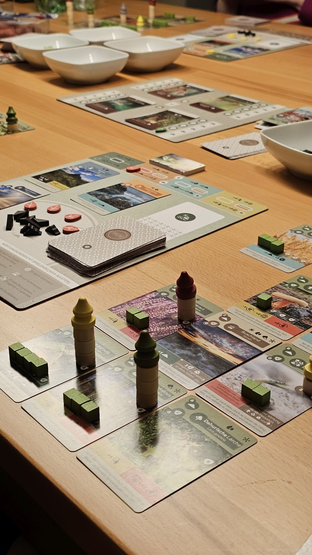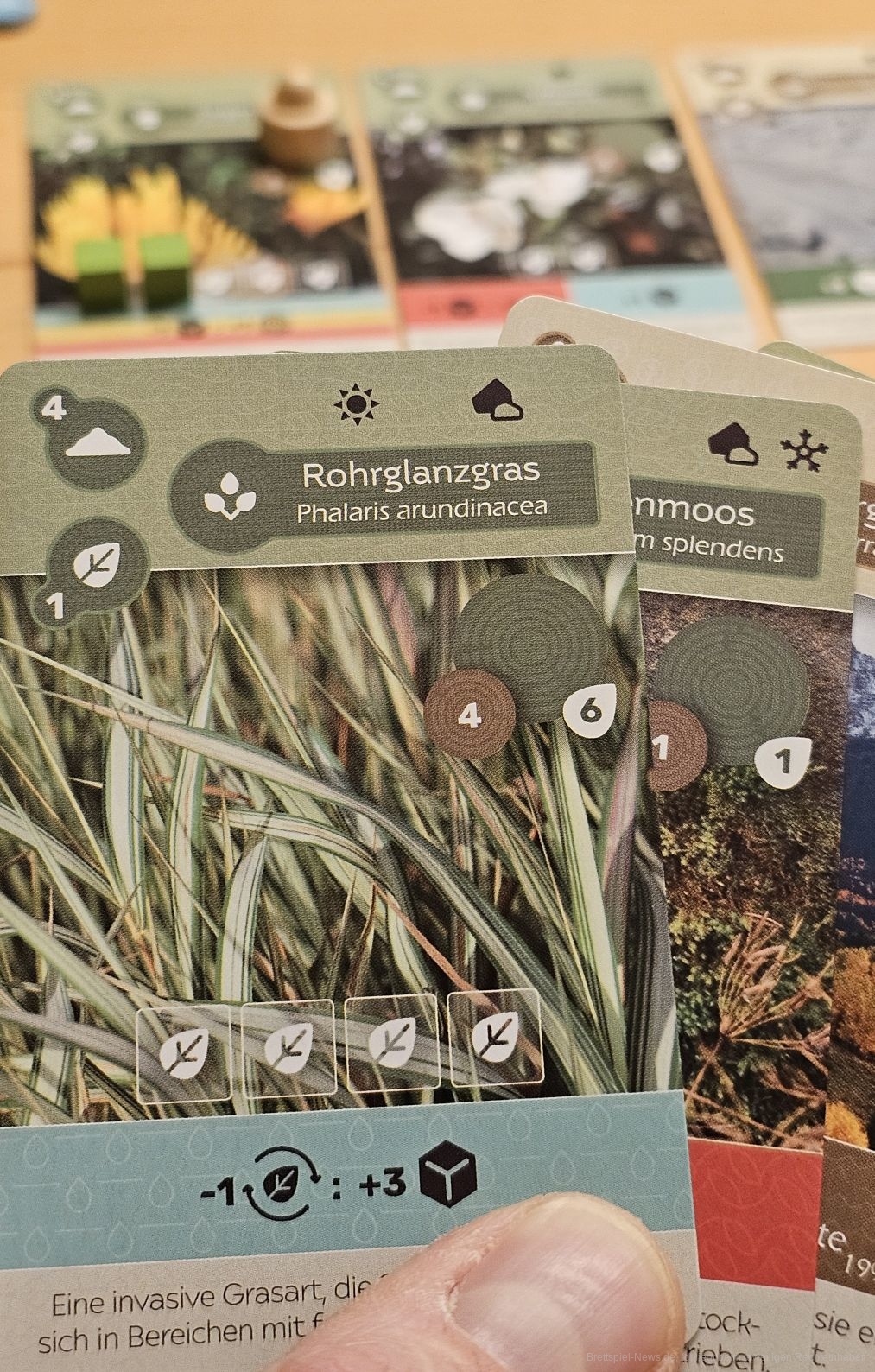 Es gibt verschiedene Arten von Karten. Die wichtigsten Kartenarten sind die Terrain-Karten, welche uns dauerhafte Vorteile oder alternative Möglichkeiten, zu punkten, ermöglichen, und Pflanzen. Pflanzen können wachsen oder Sprossen austreiben. Dieses wird mit Holzmarkern symbolisiert, die ebenfalls wieder zu einer Ressource werden können. Zudem haben die Pflanzen Aktionsfarben, die unsere gewählten Aktionen erweitern.