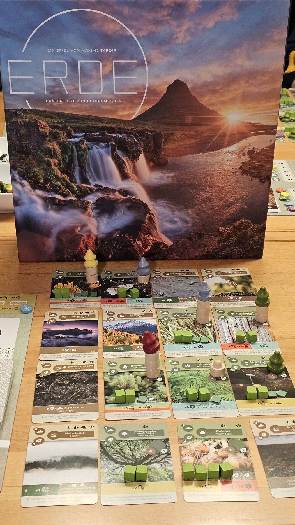 "Erde" ist ein Aktionsauswahl-, Enginebuilding- und Tableaubau-Spiel für 1–5 Personen ab 12 Jahren mit einer Spieldauer von etwa 30 Minuten pro Person, in dem wir unsere Insel mit Pflanzen bevölkern.