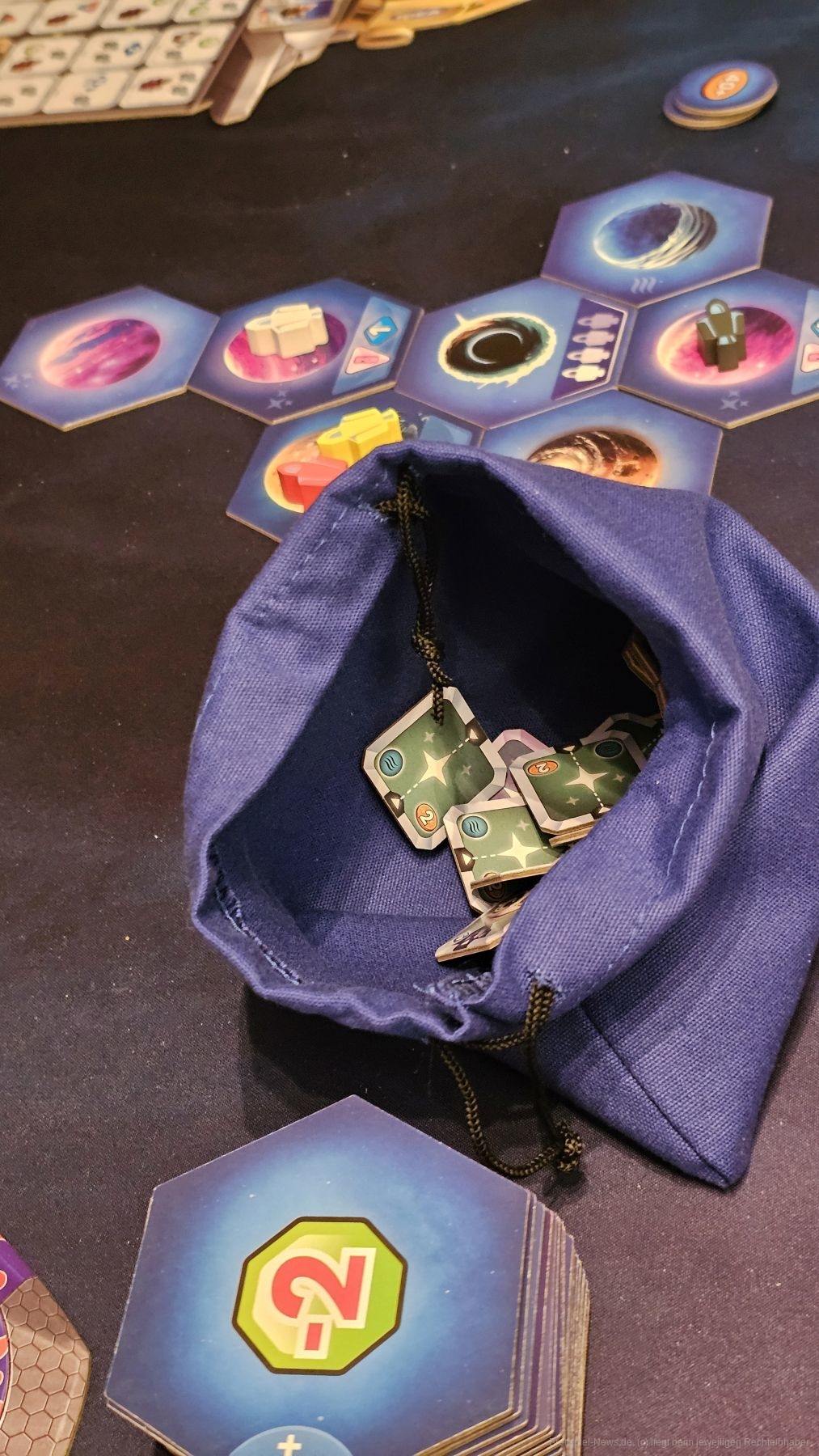 Der Weltraum expandiert mit vielen Personen viel stärker, sodass wir mehr Optionen haben. Das Erkunden selber ist eine nicht zu unterschätzende Mechanik, die aber auch etwas Glück mitbringt. Erkunden wir einen neuen Planeten, erhalten wir Siegpunkte oder Proben, die später Siegpunkte bringen können. Entscheiden wir uns, mit dem letzten Tropfen Treibstoff ein neues Weltraum-Plättchen aufzudecken, müssen wir mit dem leben, was wir vorfinden. So bildet das Erkunden eine Mechanik, die zufällig ist, aber in Kombination mit anderen Aktionen sehr viele Siegpunkte abwerfen kann.
