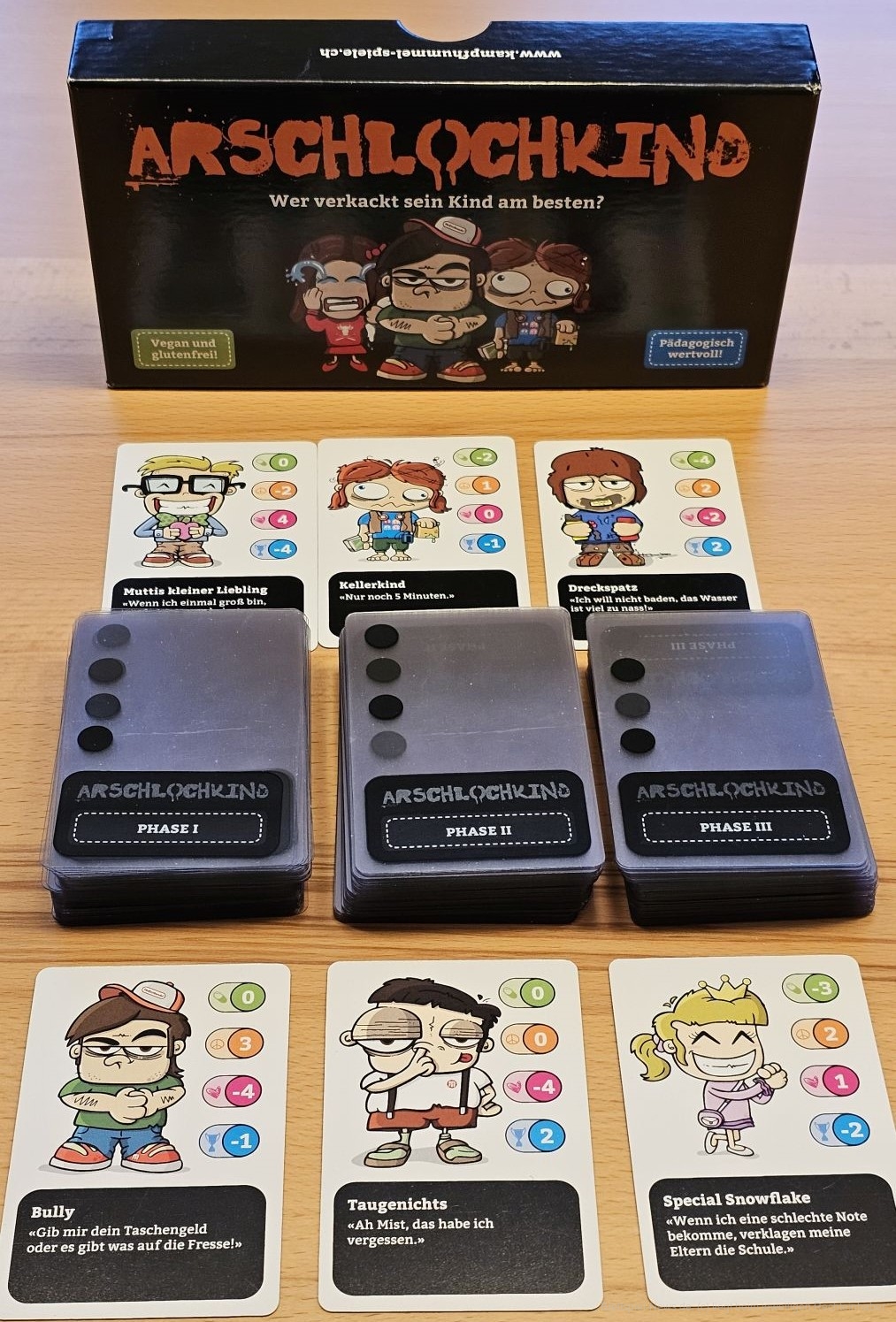"Arschlochkind" ist ein satirisches gemeines Kartenspiel für 3–6 Personen ab 16 Jahren mit einer Spieldauer von 30–45 Minuten, in dem wir versuchen, unser eigenes Kind zu verziehen und positiv auf die Kinder der anderen Personen am Tisch einzuwirken.