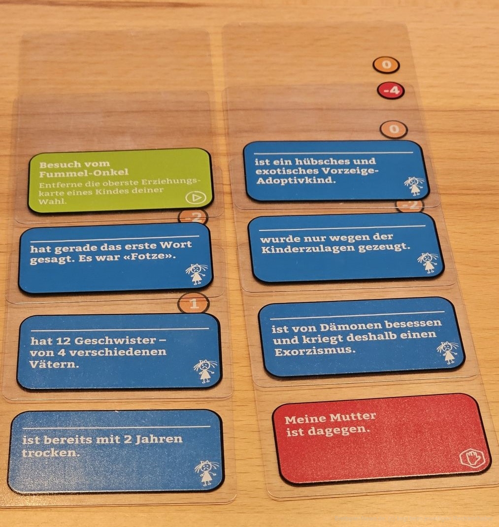 Alle Karten sind transparent. Dadurch werden nur die Eigenschaften der Kinder überdeckt, wenn wir sie "erziehen". Die Erziehungskarten sind positiv oder negativ. Positive Karten spielen wir im besten Fall auf andere Kinder, negative auf unsere eigenen. Wir spielen drei Lebensphasen der Kinder, welche jeweils eine Wertung haben. Die Lebensphasen werden dabei immer extremer, in ihren Ausprägungen und der Art, wie wir schlechten Einfluss ausüben können.