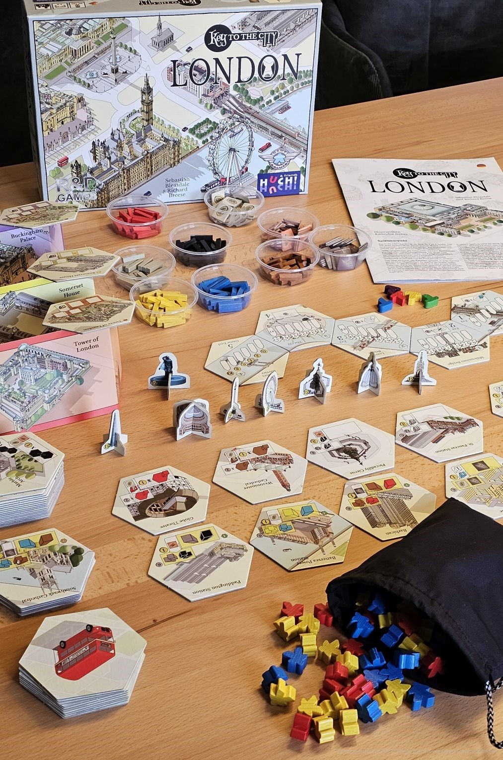 "Key to the City: London" ist ein Bietspiel, in dem wir auch Plättchen legen, Sets sammeln und Arbeiter platzieren, um den Stadtteil mit den meisten Siegpunkten zu bauen. Es ist für 2–6 Personen ab 14 Jahren, die ungefähr 30 Minuten pro Person mit dem Spiel verbringen werden.