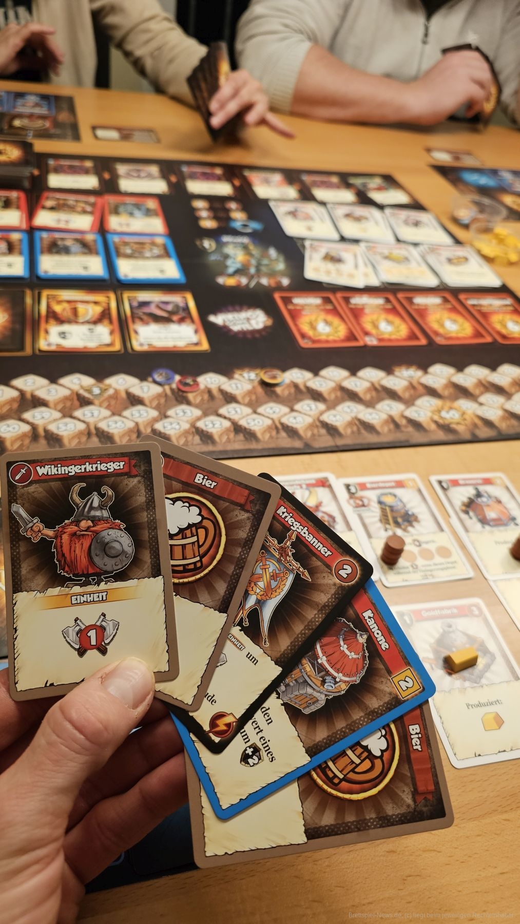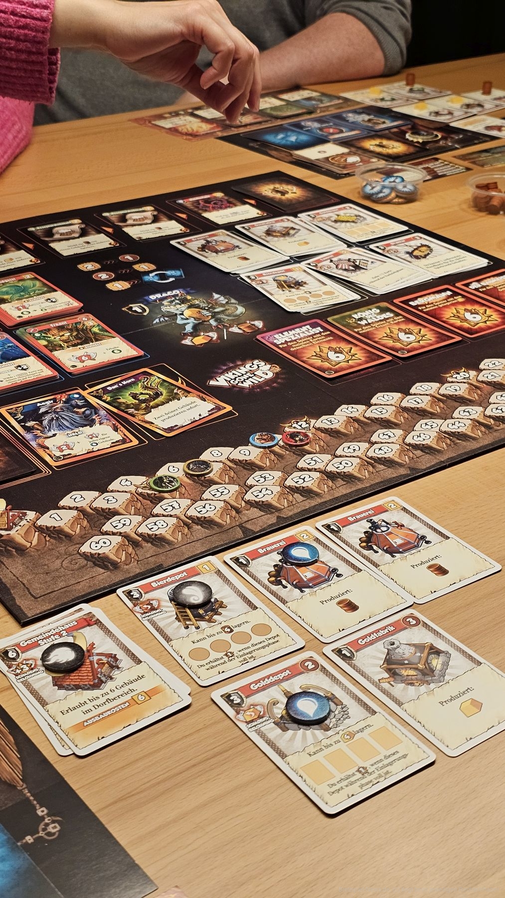 Sind wir am Zug, können wir unsere Handkarten ausspielen, um Aktionen auszuführen. Wie bei den meisten Deckbuilding-Spielen starten wir alle mit dem gleichen Deck und verbessern dieses. So können wir zu Spielbeginn noch nicht viel abseits der Standardaktionen machen. Haben wir Angriffskarten auf der Hand, greifen wir den Gegner auf dem Spielbrett an, um ihm Ressourcen zu klauen. Später fokussieren wir die Angriffe auf die anderen Wikinger am Tisch. Haben wir Bier oder Gold auf der Hand, können wir damit neue Karten kaufen, um unser Deck zu verbessern ODER (und das hebt "Vikings Gone Wild“ z. B. von "Dominion" ab) Gebäude, die wir in unser Dorf spielen.