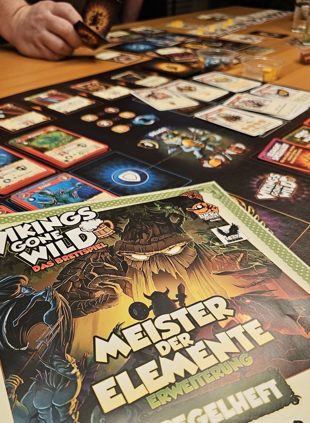 Die Erweiterung "Meister der Elemente" kommt mit einem Tableau, auf dem der Meister der Elemente und Artefakte platziert werden, und bringt neben Bier und Gold 3 weitere Ressourcen, die Elemente, ins Spiel. Der Meister erschafft uns Elemente und mit den Artefakten können wir diese nutzen, um besondere Effekte zu wirken. Die Artefakte werden zu Spielbeginn gedraftet, sodass jede Person ihre Fähigkeiten nach eigenem Belieben zusammenstellen kann.