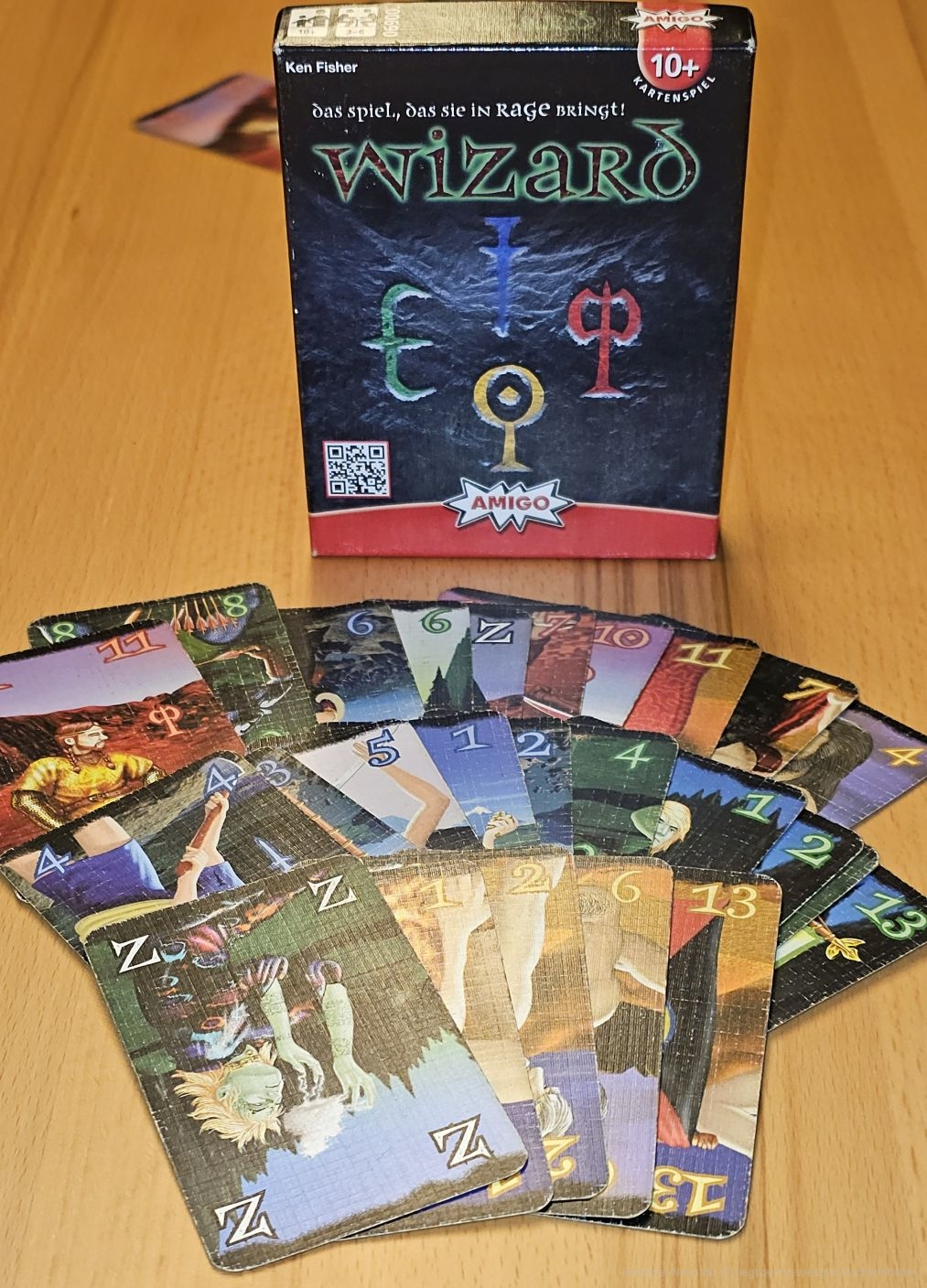 "Wizard" ist ein Stichspiel für 3–6 Personen ab 10 Jahren, in dem wir in meistens viel zu langer Spielzeit versuchen, die Menge unserer zukünftigen Stiche vorherzusagen.