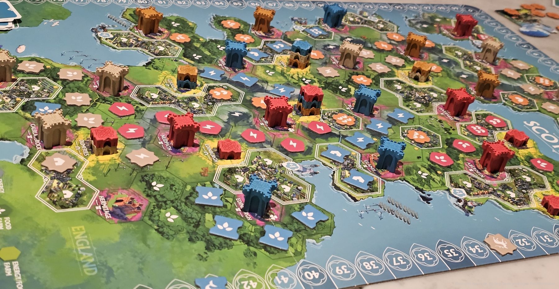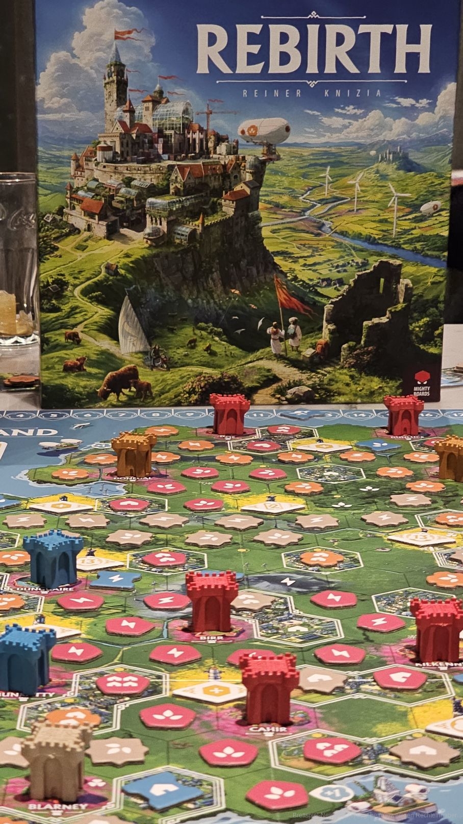 Sieht man das Spielfeld nach einer Partie "Rebirth“, ohne das Spiel zu kennen, wird man hier ein hochkomplexes Spiel vermuten. Wie unglaublich schnell die Züge beim Schottland-Spielplan sind und wie einfach die Spielmechanik ist, kann man kaum glauben.