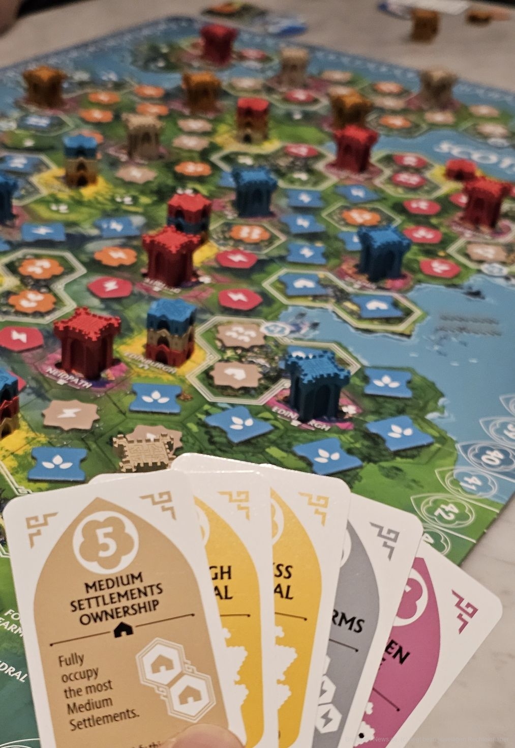 Vor uns liegt das zerstörte Schottland in einer Art Solar-Punk-Welt. Wir müssen dieses Land nun mit Pflanzen, Energie und Siedlungen versorgen. Vor uns liegen verdeckte Plättchen, die entweder Energie, Nahrung oder eben Siedlungen darstellen. In unserem Zug nehmen wir ein Plättchen und platzieren dieses irgendwo auf dem Plan. Legen wir es neben eine Burg und haben dann die meisten Plättchen neben der Burg, setzen wir zusätzlich die Burg unserer Farbe auf das Feld. Kloster können mehrere Personen beanspruchen. Diese geben uns Aufträge, die wir erfüllen können, um Bonuspunkte am Spielende zu erhalten. Die Siedlungen geben erst Punkte, wenn sie gefüllt sind. Wer die meisten Häuser auf den gelegten Plättchen hat, erhält auch die meisten Punkte.