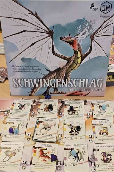"Schwingenschlag" ist ein Tableau-Building-Spiel mit Ressourcen- und Hand-Management-Elementen für 1–5 Personen ab 12 Jahren, mit einer Spielzeit von gut 30 Minuten pro Person, in dem wir für Drachen Höhlen ausgraben und sie dann anlocken, um auf verschiedenste Weise Boni und Siegpunkte dafür zu erhalten.