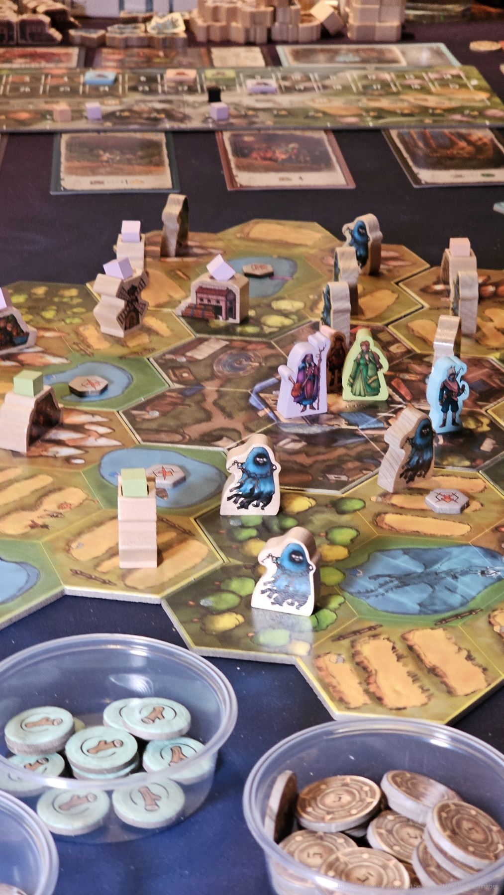 Zu Spielbeginn sind die verfluchten Lande unbesiedelt und reich an Ressourcen. Vor uns liegt ein Tableau, das unsere Aktionsmöglichkeiten abbildet. Anfangs können wir uns etwas bewegen, einmal ernten, einmal bauen und einen Geist verjagen. Wir sind der Reihe nach am Zug und nutzen alle unsere Aktionen, bevor die nächste Person am Zug ist.