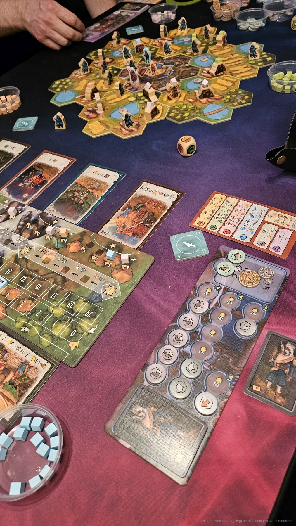 Vertreiben wir Geister, wird ein Würfel geworfen, um die Belohnung zu ermitteln. Diese können gerade zu Spielanfang und Spielende sehr gut passen oder eben nicht. Da kann etwas Würfelglück schon spielentscheidend werden. Allerdings gibt es eine nette Mechanik, um aufholen zu können, wenn man hinten liegt. So bekommen alle außer dem Führenden nach der ersten Jahreszeit eine und nach der zweiten zwei Endwertungskarten.