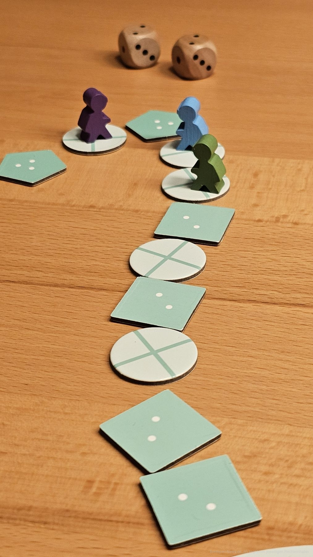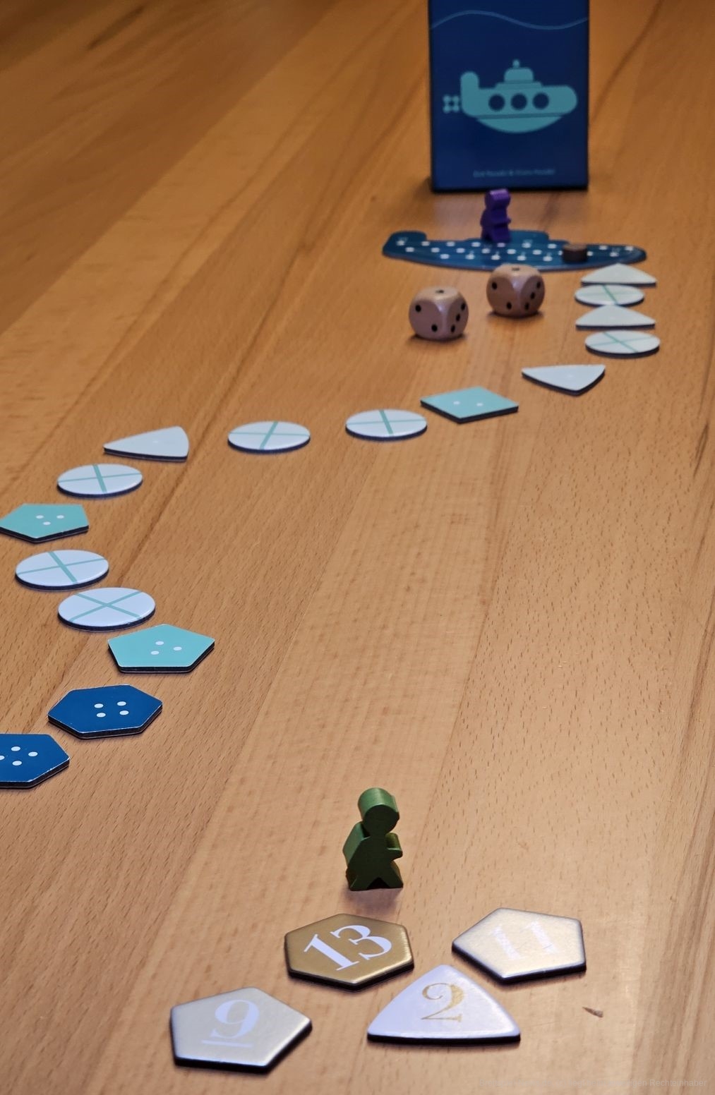 Die Würfel zeigen Werte von 1–3. Somit ist der höchste Wert, den wir erreichen können, 6. Entscheiden wir uns, umzukehren, also zum U-Boot zurückzutauchen, dürfen wir zwar weiterhin Schätze aufnehmen, aber nicht erneut die Richtung wechseln. Passieren wir auf unserem Tauchgang Felder mit konkurrierenden Tauchern, dürfen wir diese überspringen. Das macht das Spiel gerade mit vielen Personen spannend. Schließlich müssen wir mit den Schätzen das Boot erreichen, oder wir verlieren alles, was wir tragen, und es fällt auf den Meeresgrund zurück.