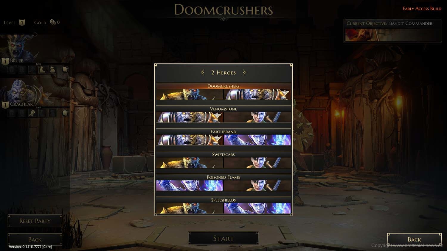 Im Auswahl-Bildschirm zu Beginn des Abenteuers können verschiedene Kombinationen aus den vorhandenen 4 Helden ausgewählt werden und sind mit jeweils unterschiedlichen Team-Namen versehen. Ich habe mich bei meinen ersten Schritten für das Team Swiftscars (was in etwa „schnelle Narben“ bedeutet) mit Brute und Scoundrel entschieden, da dies auch die ersten Helden waren, die ich beim Brettspiel gespielt habe. Der Scoundrel ist zudem der Charakter, den ich aktuell noch immer spiele und den ich am liebsten niemals in Rente schicken möchte.