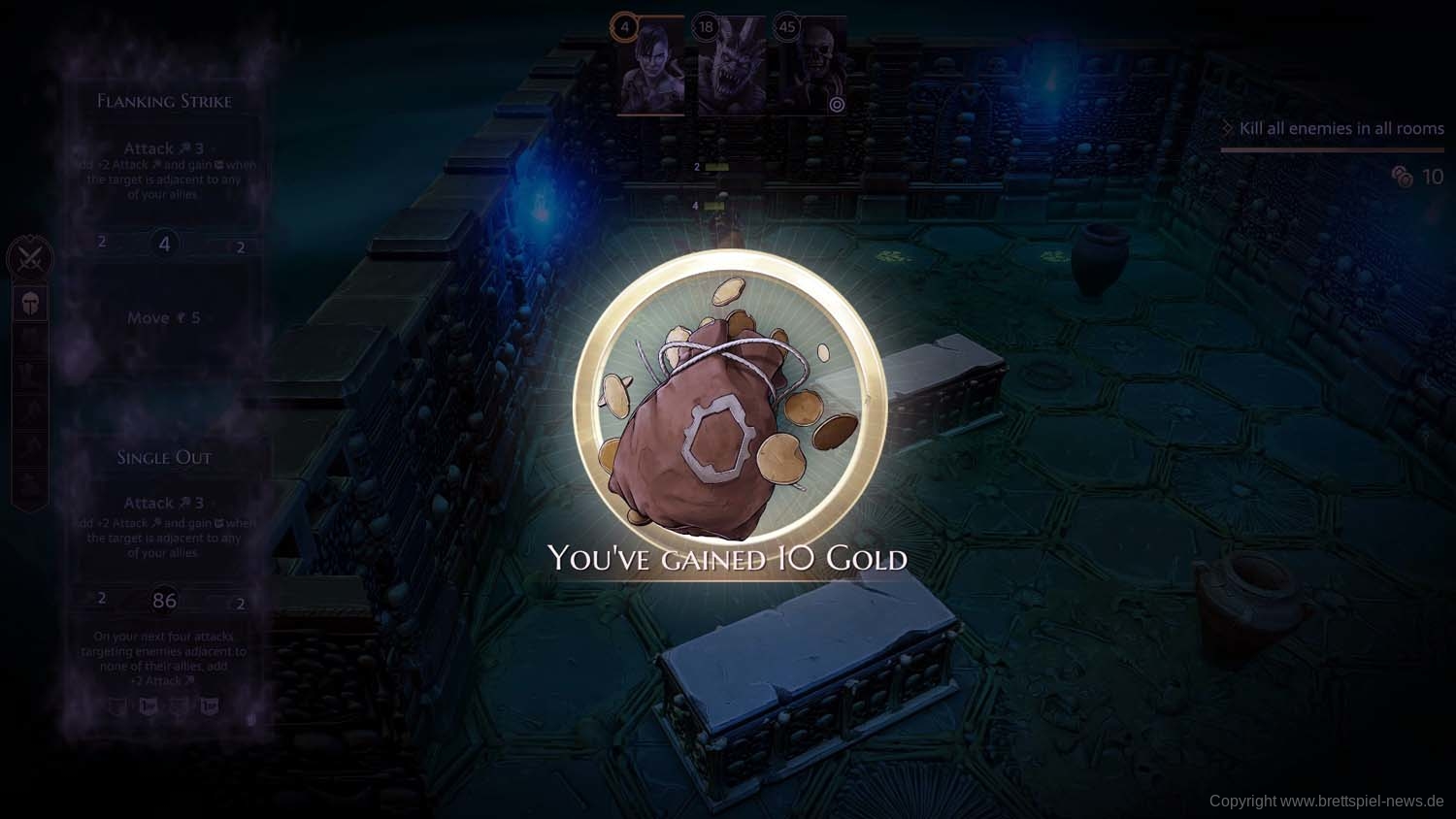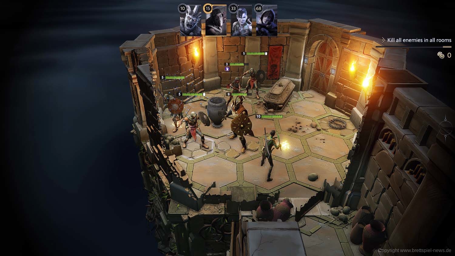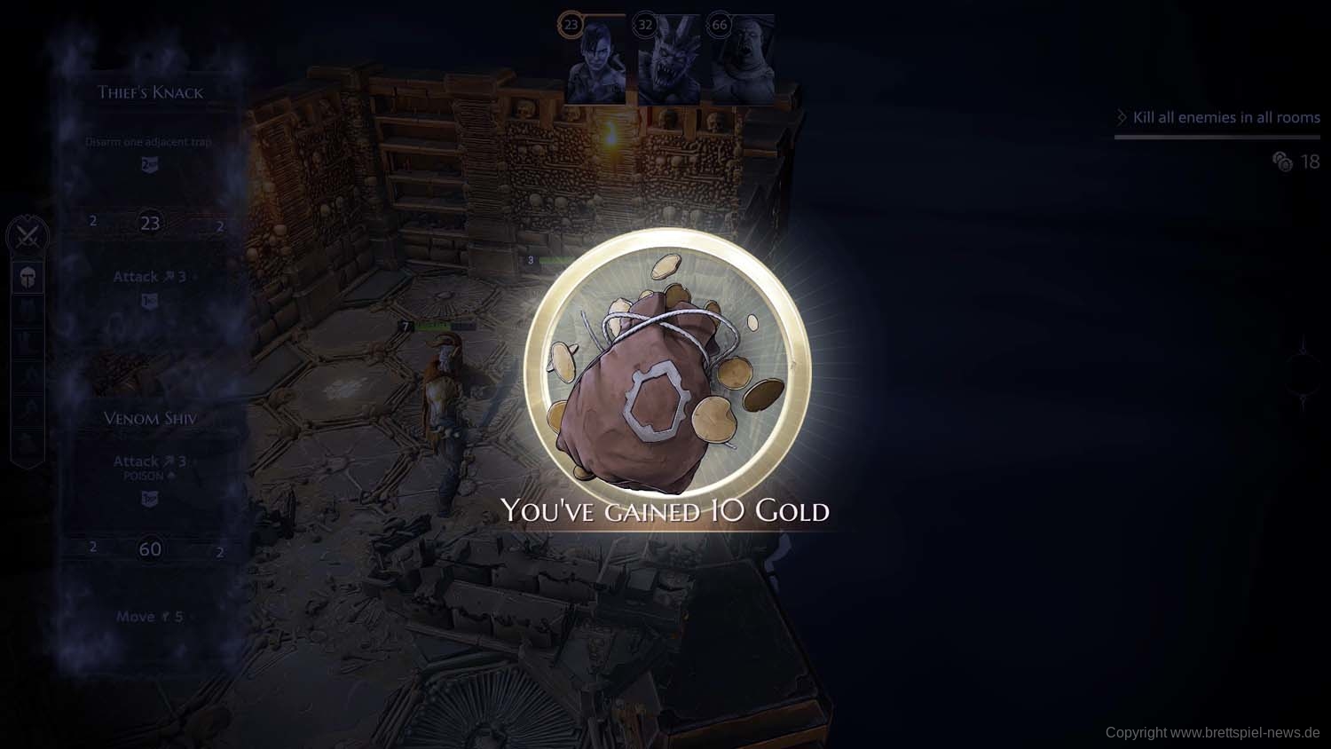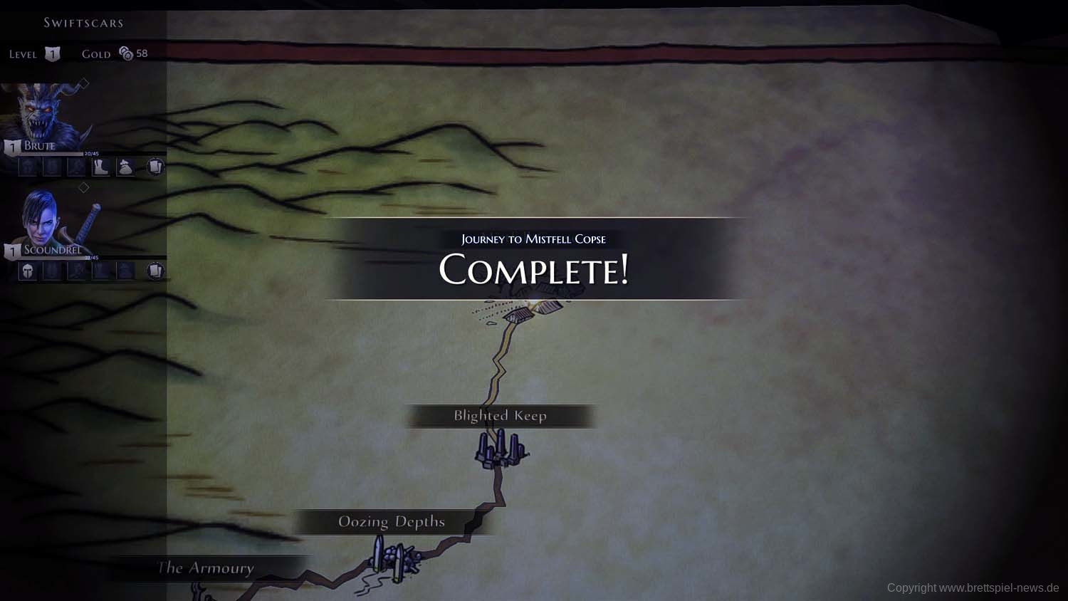 Und so geht es dann im Abenteuer-Spiel von Gegner zu Gegner, von Raum zu Raum und schließlich von Dungeon zu Dungeon, bis das zu Beginn gewählte Etappenziel erreicht wurde und die Belohnung an die Gruppe ausgeteilt wird. Ich habe rund 2 Stunden gebraucht, um die erste Aufgabe zu erledigen. Die Umsetzung der Steuerung fand ich dabei sehr intuitiv und es gab keinen Moment, bei dem ich mich verloren fühlte oder etwas nicht in der Art funktionierte, wie ich es vom Brettspiel kannte.