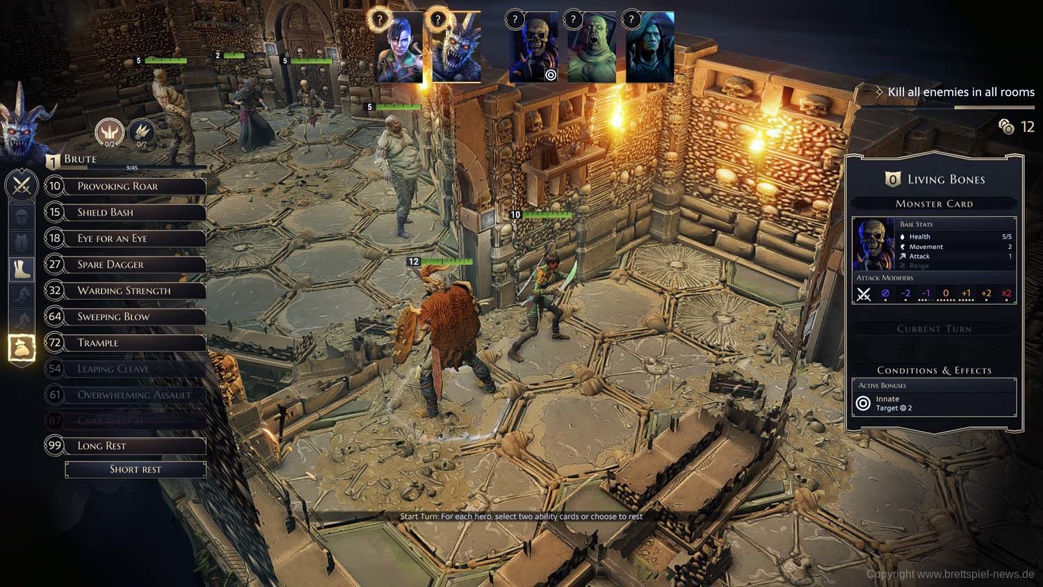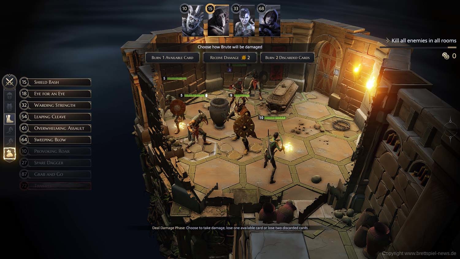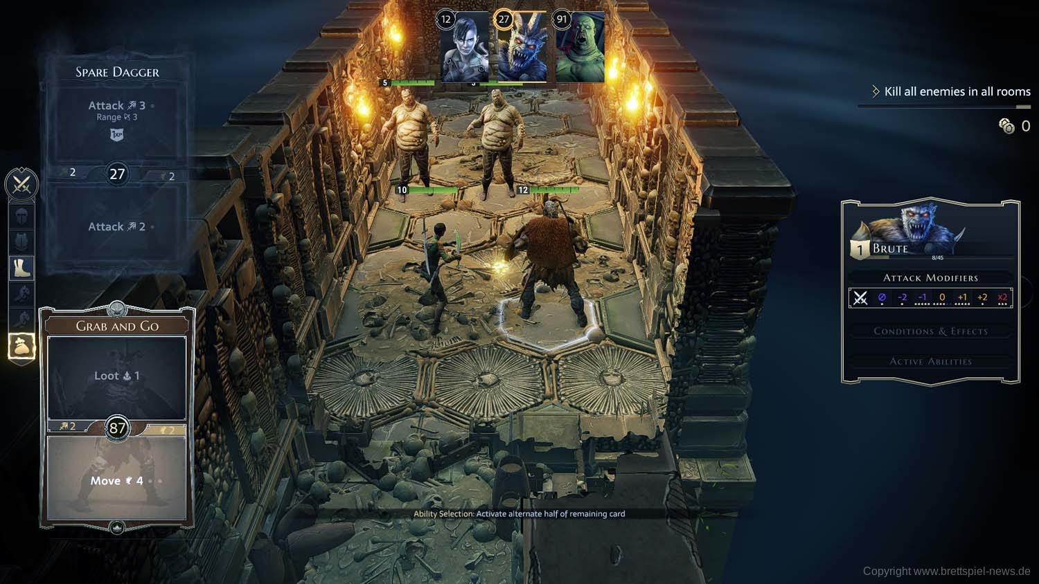 Die Ausführung einzelner Aktionen fällt beim derzeitigen Versionsstand teils noch ein wenig hakelig und umständlich aus. Möchte man seinen Helden z.B. nur 1 statt der auf der Karte angegebenen 2 Felder bewegen, bedarf dies z.B. mehrere Bestätigungsklicks. Beim Push eines Gegners in eine Wand versagt das Programm schon einmal den Wunsch. Bei der Wegfindung der Helden werden Fallen nicht berücksichtigt, weswegen diese trotz eines anderen Weges munter durchschritten werden und die Helden Schaden nehmen. Hier gilt es dann sich Feld-für-Feld per Einzelklick zubewegen. Beim Brute hat die Trample-Funktion bei mir im Spiel ebenfalls ihre Tücken gehabt. U.a. wenn das letzte Feld aus Versehen ein besetztes war und ich anschließend trotz Rücknahme des letzten Schrittes keine Möglichkeit mehr hatte, die Fähigkeit passend einzusetzen. Das war doppelt ärgerlich, da nicht nur ein wichtiger Angriff in dem Zug ohne Wirkung verpuffte, sondern zusätzlich Trample auch noch eine der Karten ist, die nach dem Einsatz verloren geht.
