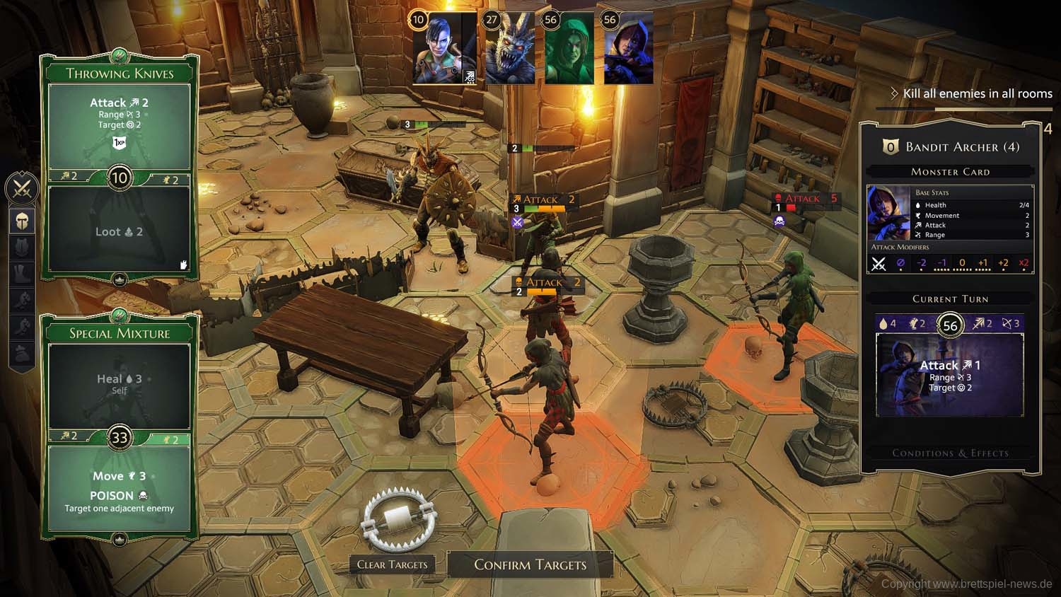 Was mich am meisten gestört hat war, dass ich zu Beginn den festen Satz mit den 1er-Karten nehmen musste, während es beim Brettspiel die Option gibt, Karten aus der X-Kategorie zu nutzen. Auch die Anzeige der Angriffsmodifikatoren muss für meinen Geschmack zusammen mit der Lebenspunkteanzeige unbedingt verbessert werden. Die viel zu kurze Anzeige des Modifikators auf dem Lebensbalken ist keine gute Lösung. Da geht schnell unter, was sehr wichtig für das Spiel ist. Bei den Helden muss auch immer wieder der Spielplan gedreht und gezoomt werden, damit die Lebensanzeige ersichtlich bleibt. Die Lebensbalken sollten unbedingt oben in die Portraits integriert werden, damit diese durchgehend gut zu erkennen sind. Das Nutzen von Gegenständen und Tränken ist ein wenig fummelig. Vielleicht wäre es einfacher hierfür ein Gegenstandsmenü aufrufbar zu machen, aus dem dann per Use-Button der gewünschte Gegenstand genutzt werden kann.